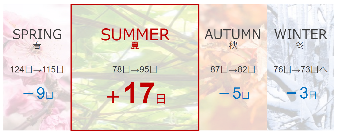 なんと、、、春秋冬の日数が減少し、『夏』の日数が大幅に増加しているのが分かります。