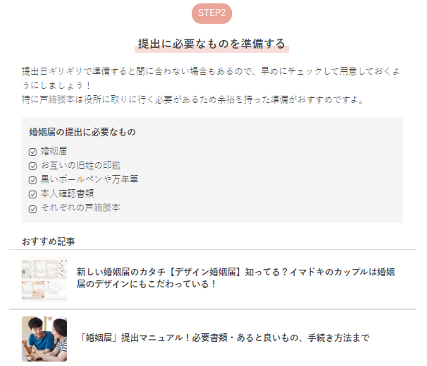 「婚姻届のキホン」コンテンツでは、カップルがスムーズに入籍日を迎えるための情報をお届けしています。婚姻届の入手方法から記入~提出などに関する記事を掲載し、カップルの不安やお悩みの解消をサポートします。