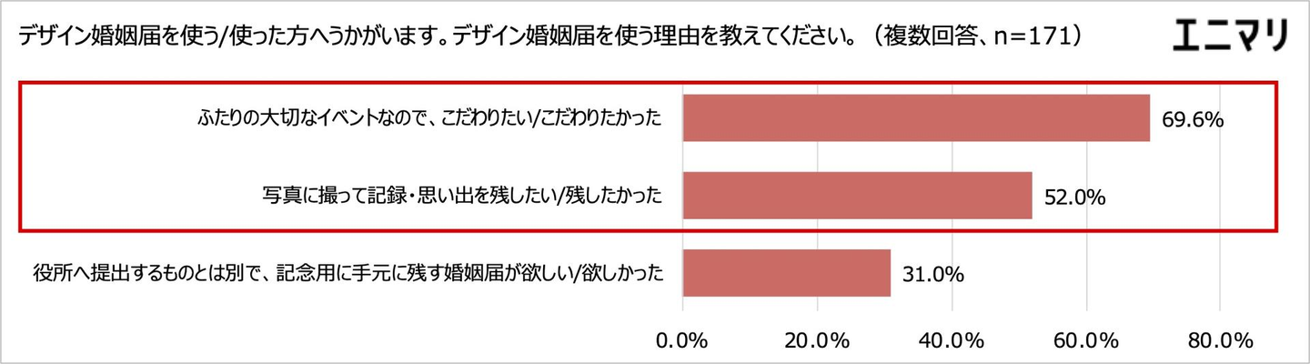 “デザイン婚姻届” を使う予定がある/使った方へ、使う理由についてたずねたところ「ふたりの大切なイベントなので、こだわりたい/こだわりたかった」との回答が69.6%で最多となり、次いで「写真に撮って記録・思い出を残したい/残したかった」が52.0%となりました。婚姻届の提出をイベントとして大切にしているからこそ、婚姻届のデザインでそれぞれのカップルらしさを表現したい、素敵な思い出にしたい、と考える方が多いことが伺えます。