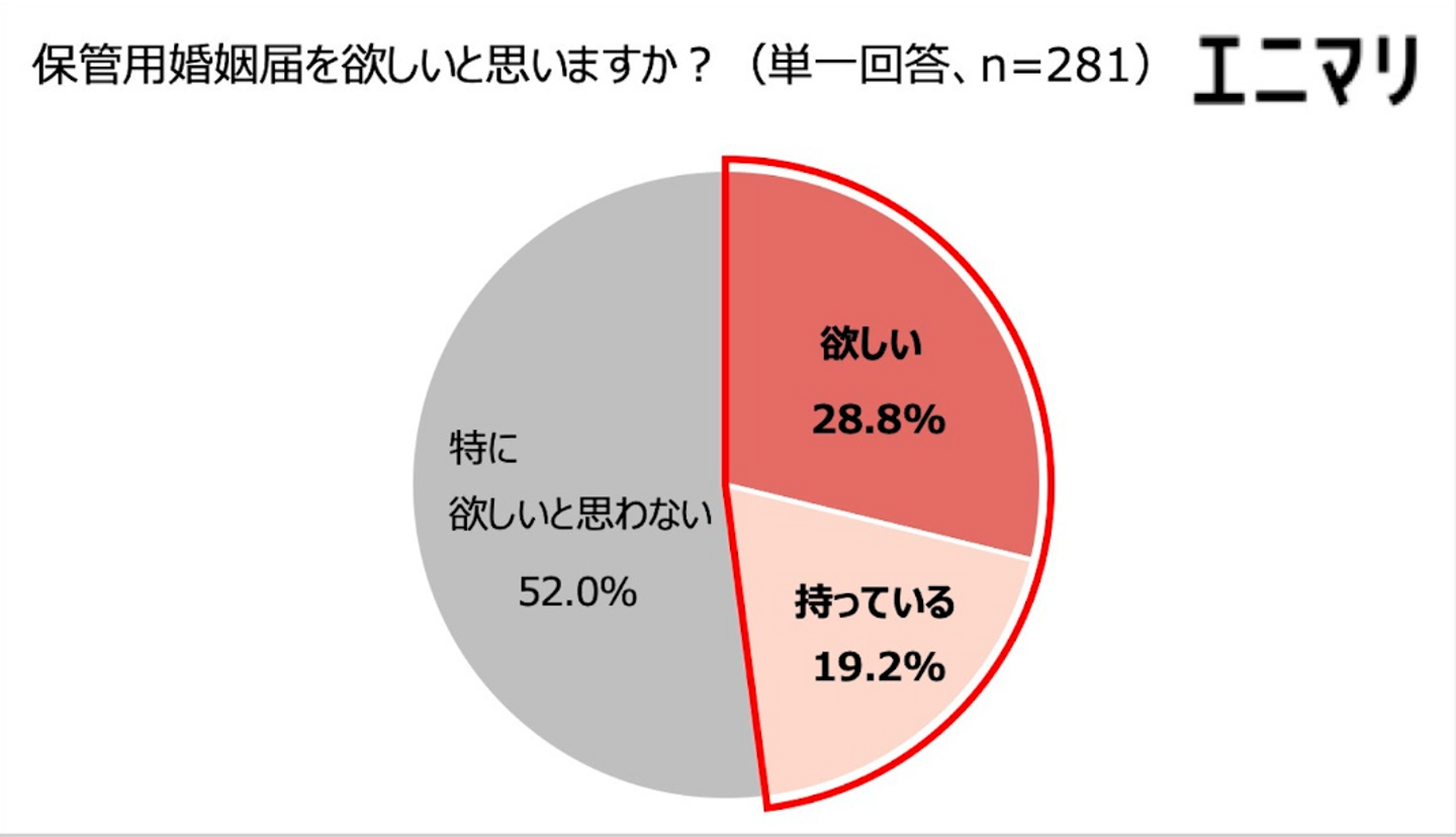 また、保管用婚姻届を欲しいと思うかどうかたずねたところ、「欲しい」「持っている」との回答が合わせて48.0%で約5割となりました。