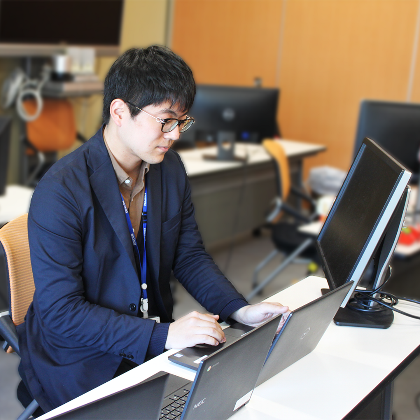 入社して1年目、パソコン教室で子どもたちが使うクライアント端末の設定を任されたことがありました。共有フォルダを見られるようにしたり、インターネットに安全に接続できるようにしたり、一から設定作業を行いました。ちゃんと動くか不安でしたが、ある日、授業を見に行く機会があり、子どもたちが自分の設定したパソコンを使っているようすを見て、当たり前に動いていることに感動したことを覚えています。