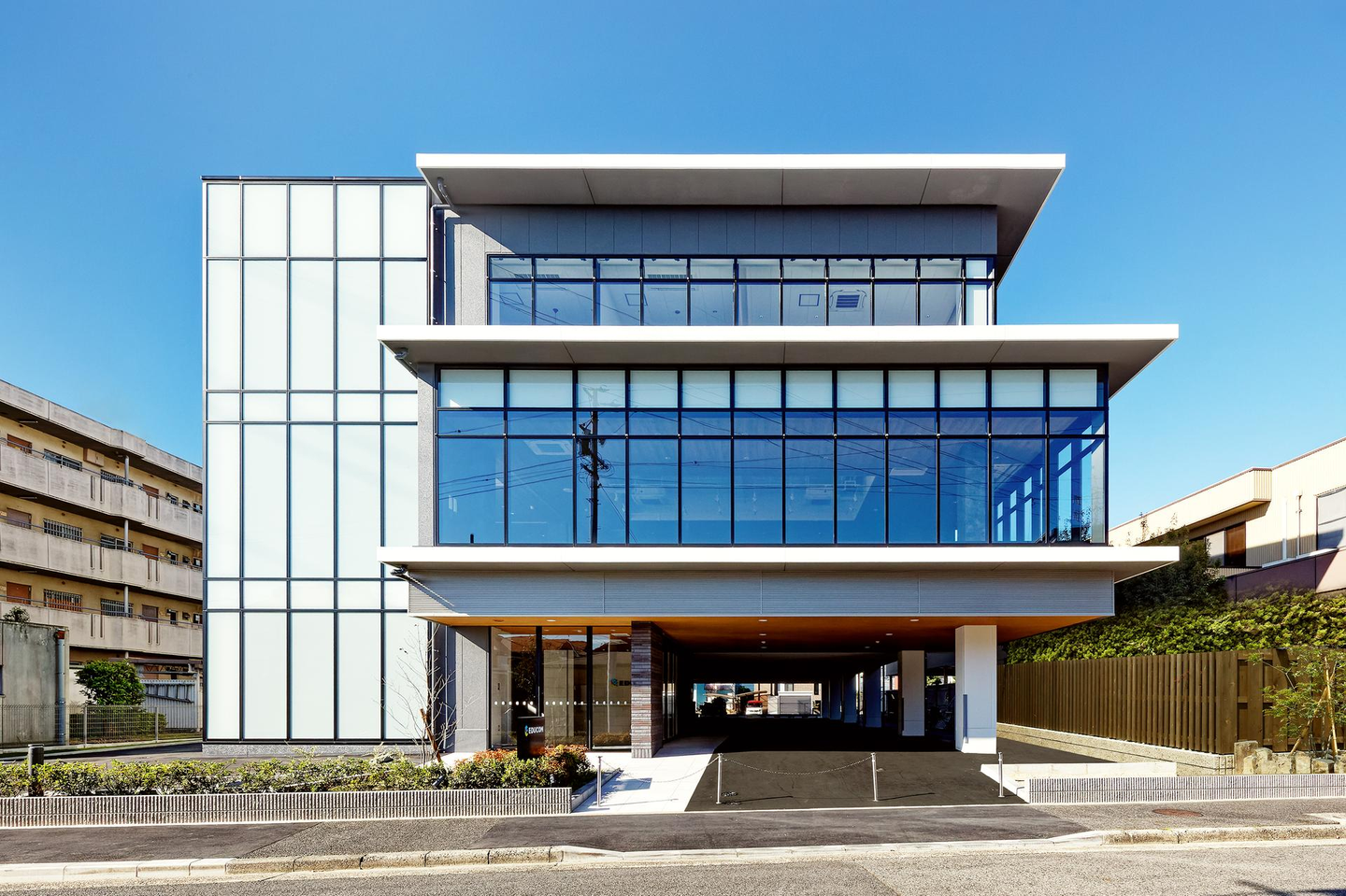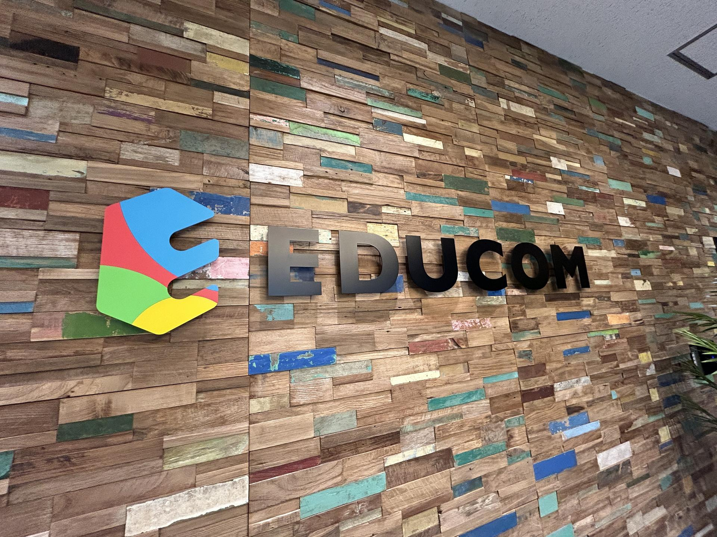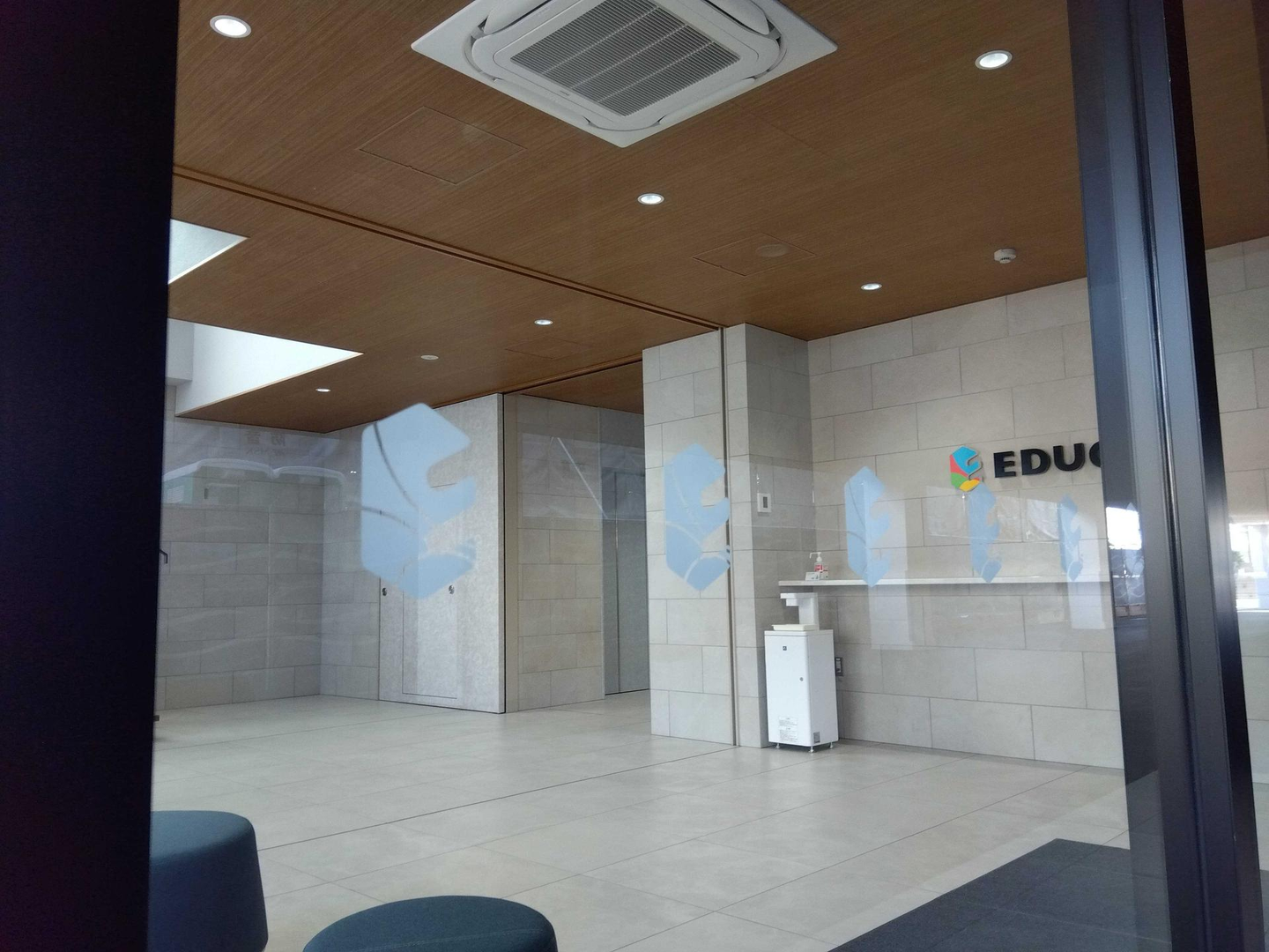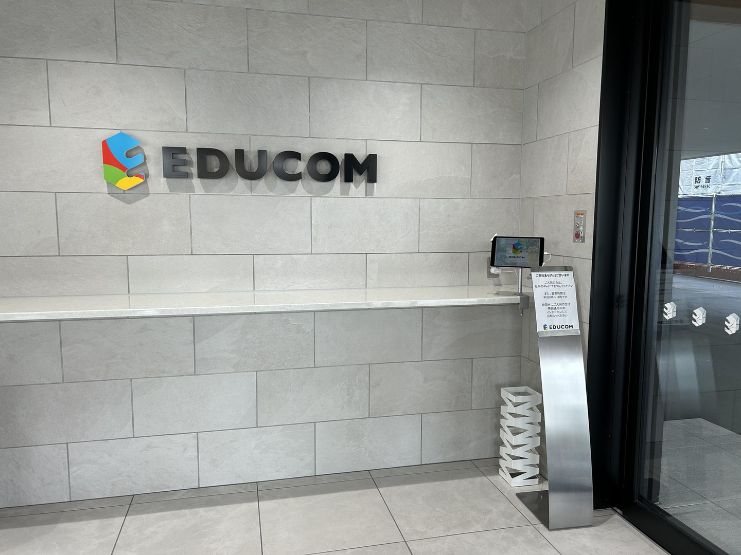 エントランス付近のガラスにはEDUCOMのコーポレートロゴマークの「E」の文字が。