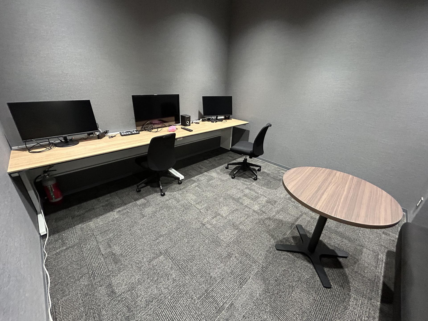 配信用動画の録画、配信用音声の録音、CS部(※カスタマーサポートの部署)のメンバーが製品説明やお客様向けの研修会をリモートで行う際などに利用する部屋です。飛行機やヘリコプターなどの騒音に配慮した防音対策がされており、音響設備も整っています。