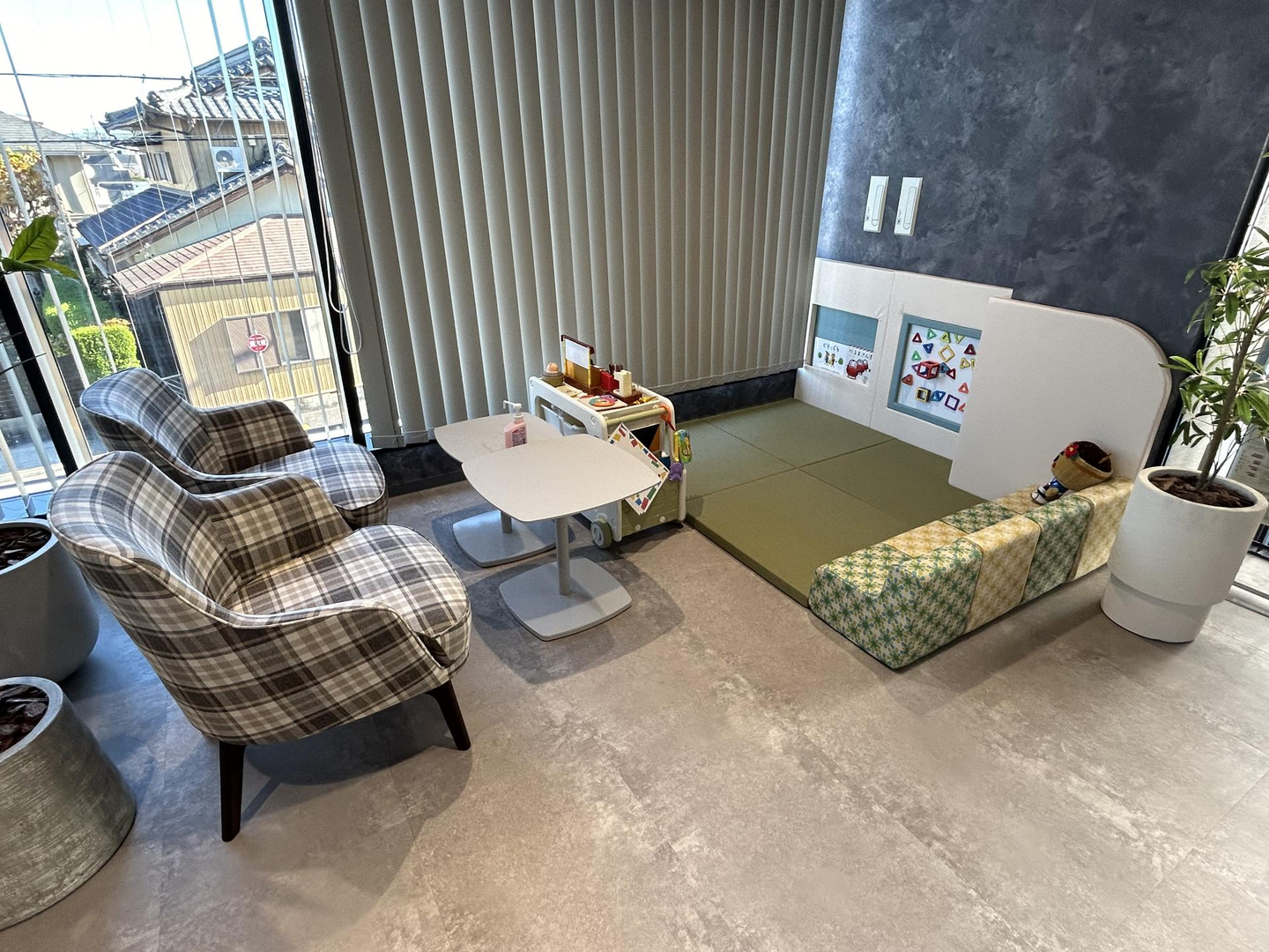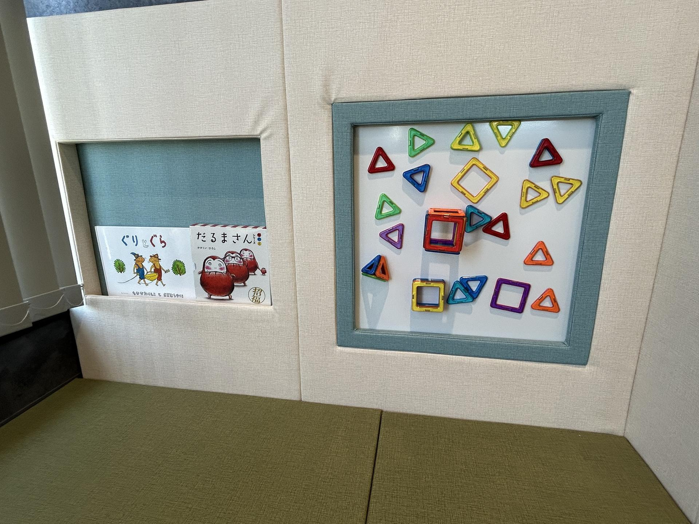 絵本やおもちゃが用意されており、子どもが靴を脱いで上がって遊べるようなスペースになっています。正面にソファとテーブルもあるので、子どもの様子を見ながら打ち合わせや面接を行うことができます。