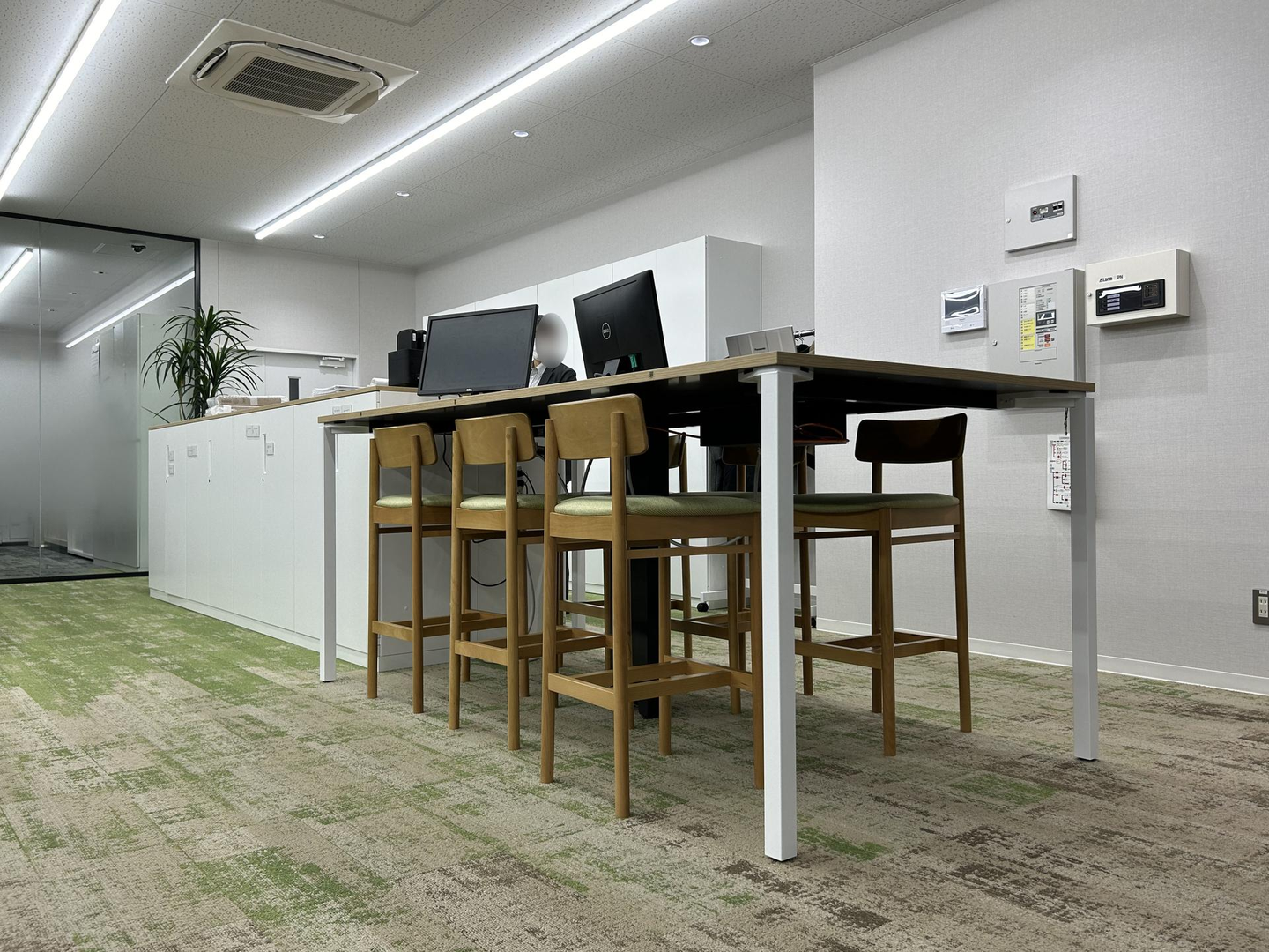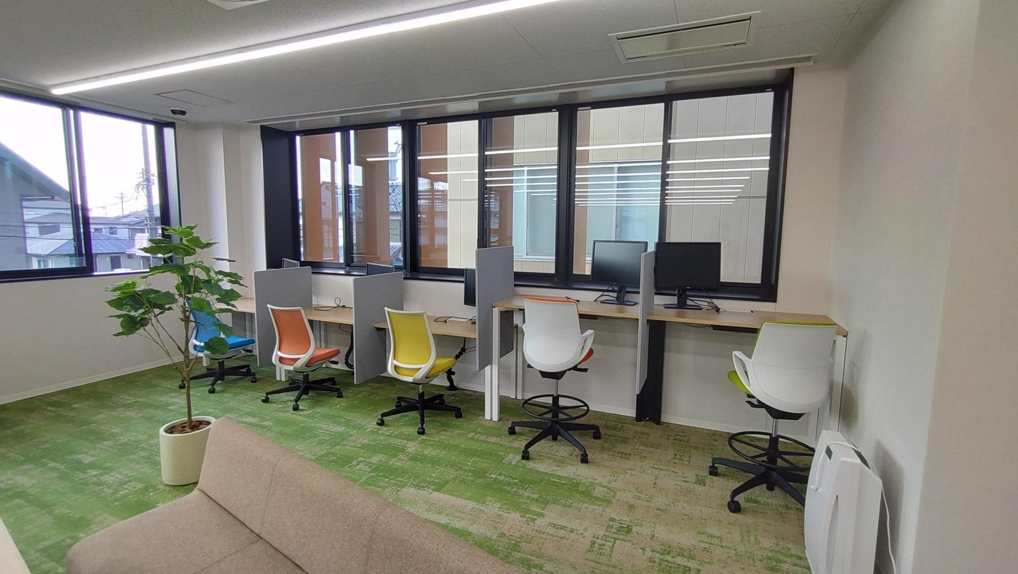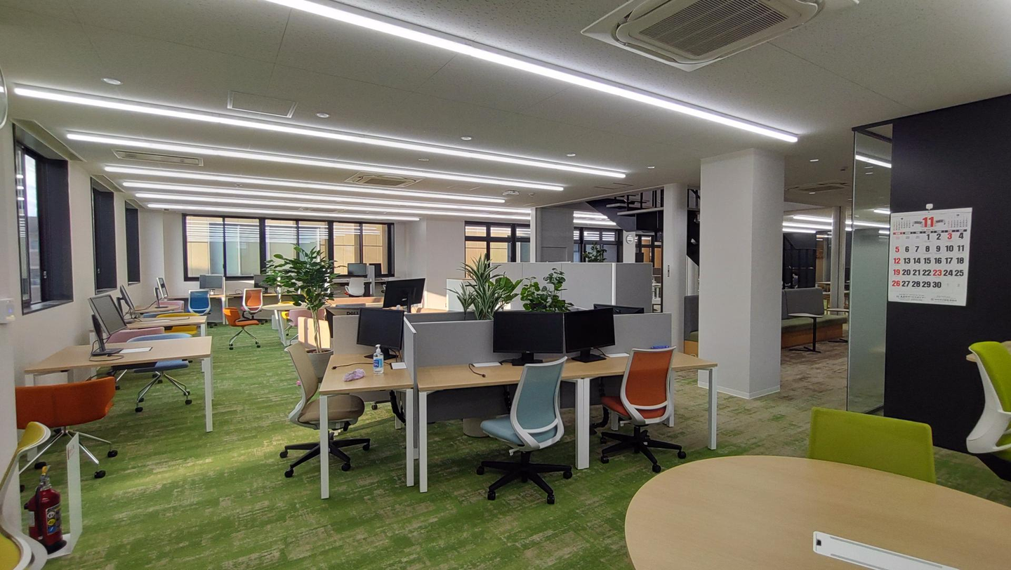 明るい印象の2階執務室、フロアのカーペットは緑・土・池をイメージした配色でナチュラルな雰囲気です🌱