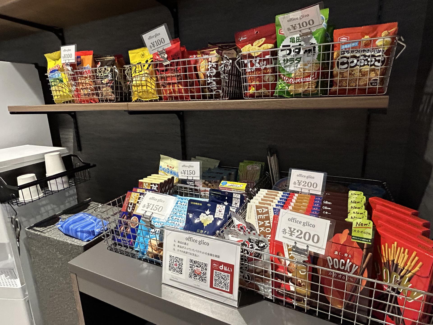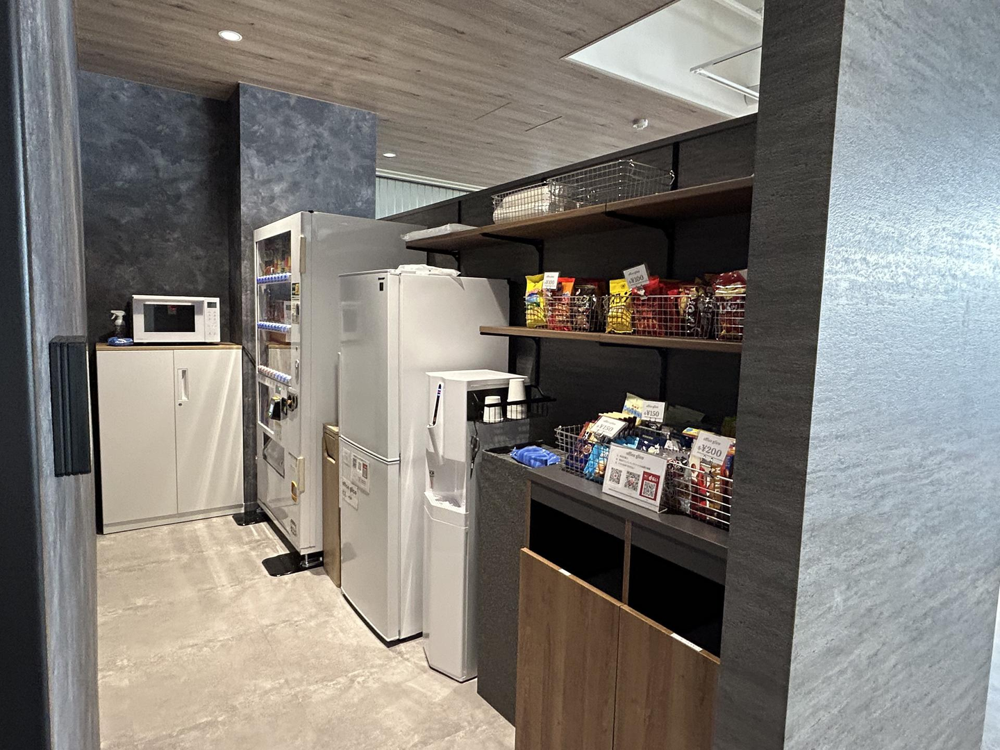 奥には、自動販売機、冷蔵庫、電子レンジ、オフィスグリコが完備。