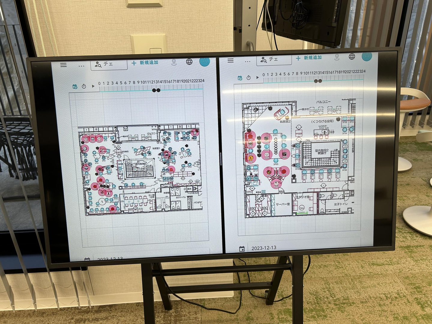 2階執務室、3階執務室、ラウンジのどこで誰が仕事しているか分からなくなることを避けるため、座席管理システムを導入しました。