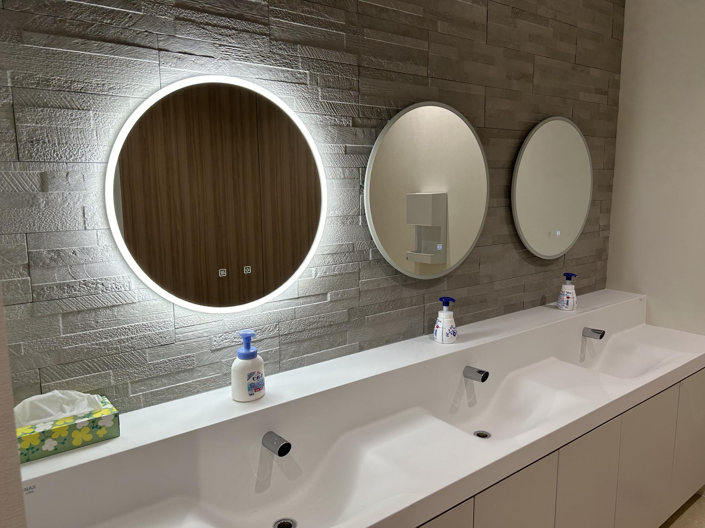 女性用トイレのミラーはボタンをタッチすると女優ミラーのごとくライトアップされ、お化粧直しがしやすいです💄✨