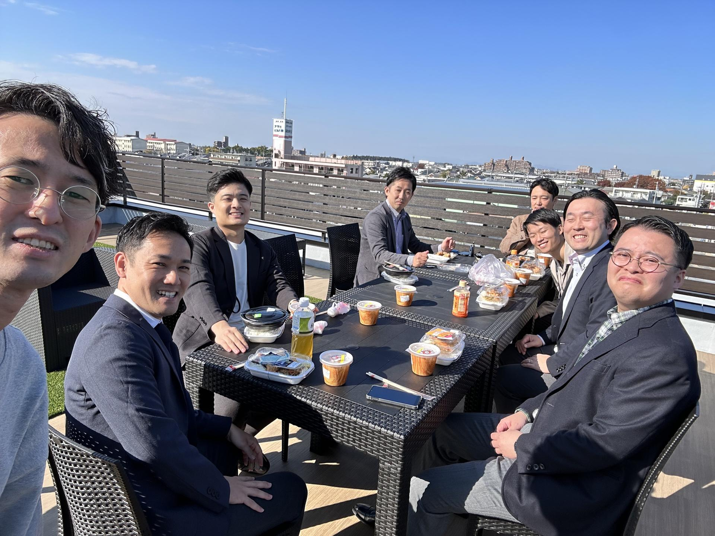 そして新社屋には屋上があるんです🏢⛅周囲に高い建物がないためとても見晴らしが良く、遠くに山も見えます。テーブルと椅子があるのでここでランチを食べたりもできます。