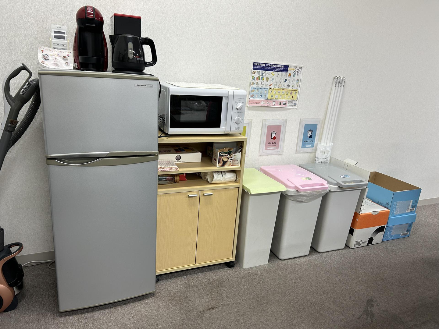 ケトル、冷蔵庫、電子レンジもあります。ほっと一息。