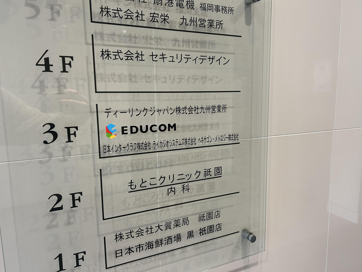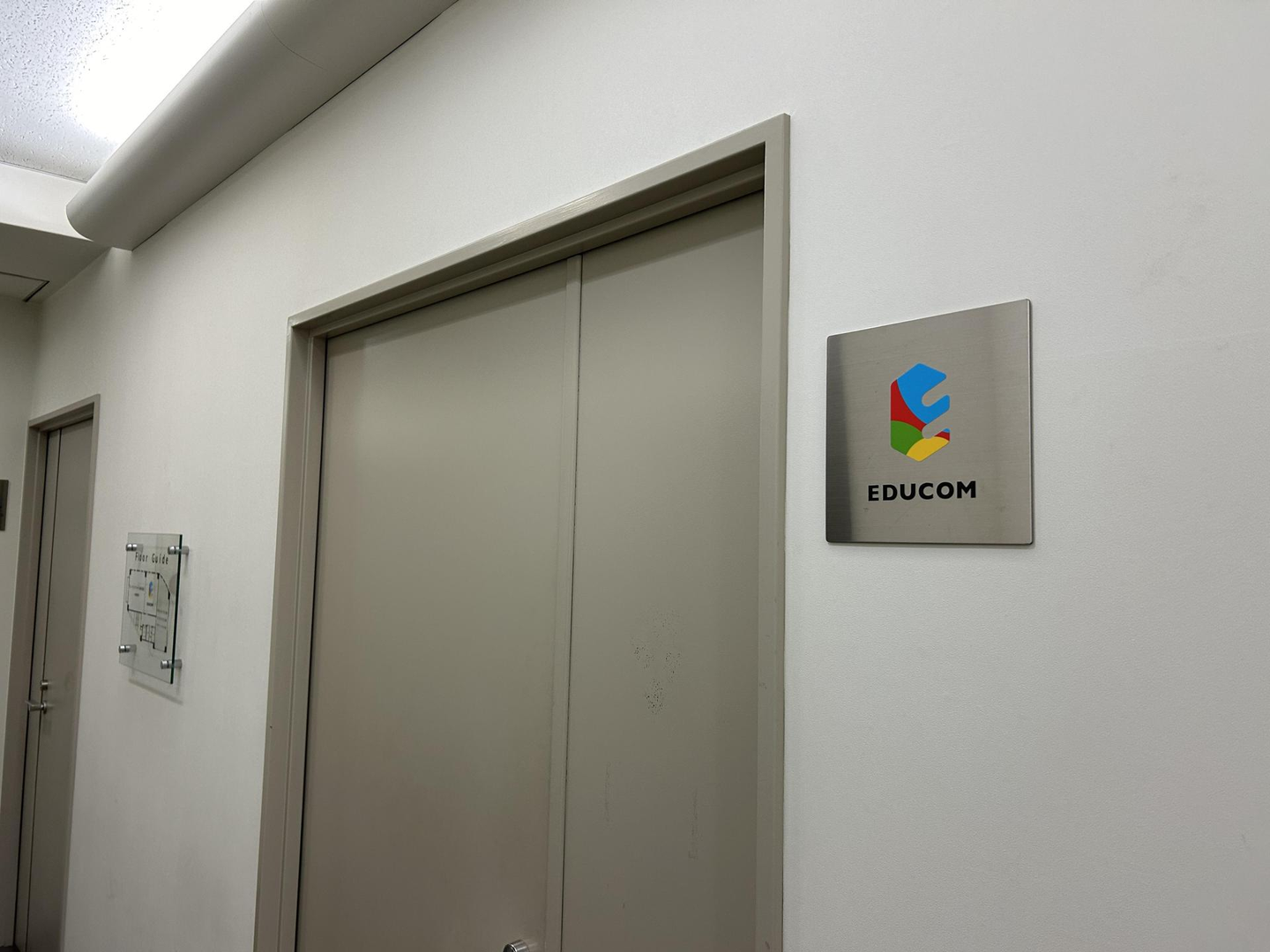 3階にあがると、EDUCOMのロゴが飾られているエントランスに到着。他社さんも入っており、EDUCOMは真ん中。コーポレートロゴが目印、エレベーターを降りて目の前です!