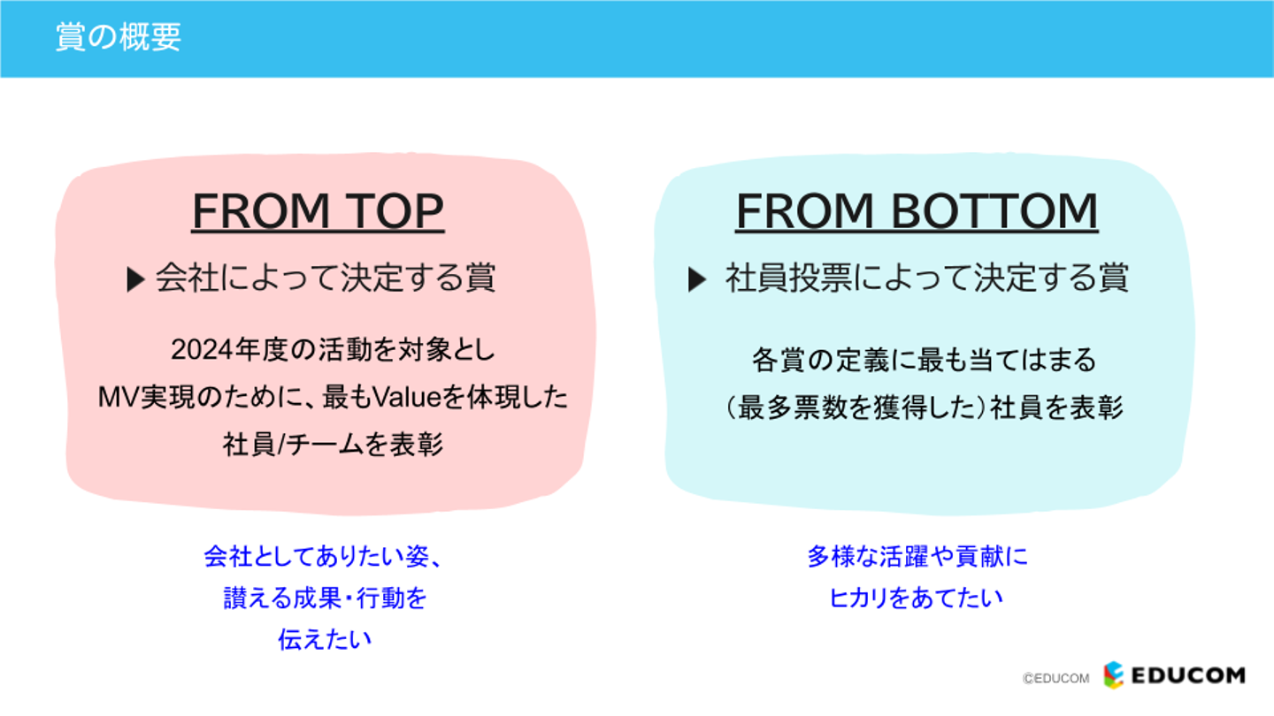 FROM TOP賞は、EDUCOMのMission・Visionを実現するために、最もValueを体現した社員/チームを表彰します。