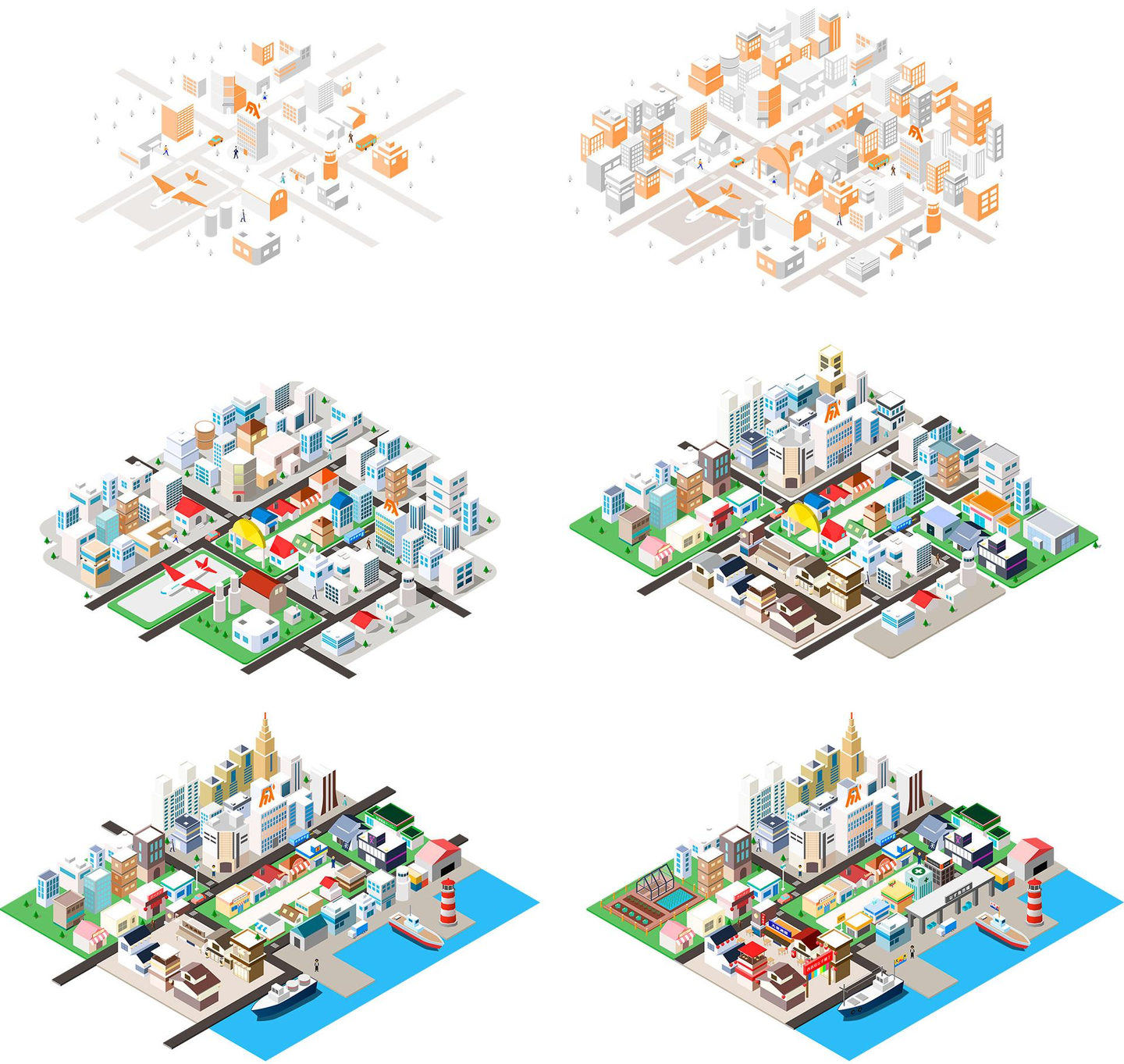 - 建物増加と配色変更: その後、もっと建物を増やしたいとのことで数を増やし(建物増画像:右上)、全体の色を変更して賑わいを出し(色変更画像:左中)、アイソメトリックな構図を横にずらしてレイアウトを調整しました。 またナシエルは支援する立場なので「中心」にあることに違和感があるとして位置を変更しました。