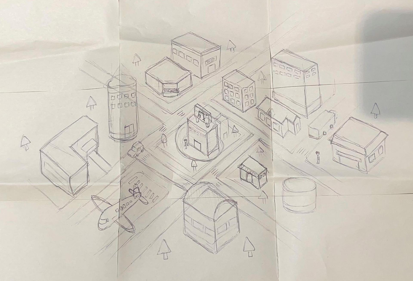 ナシエルの成長イメージを様々な店舗やビルなどを混ぜた形で手書きスケッチとして描き出しました。手書きのイメージを元にさらに具体的なビジュアルを構築するため、Figmaに移りました。