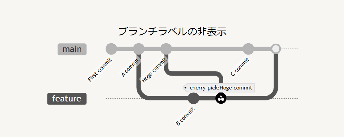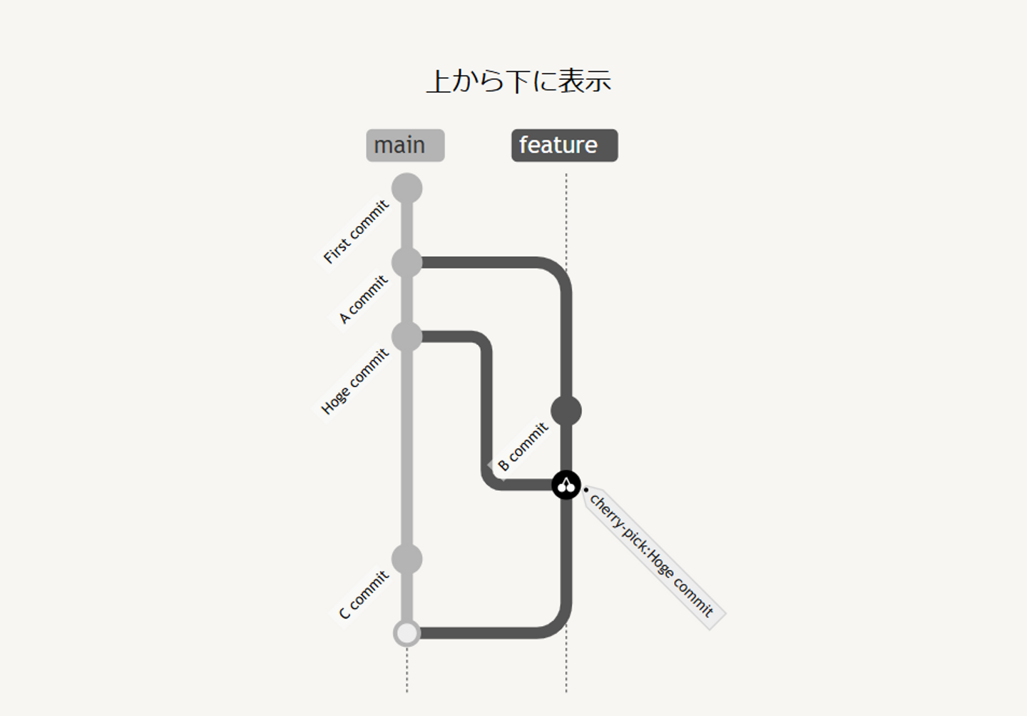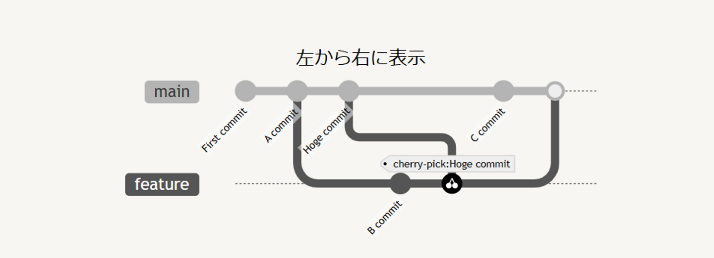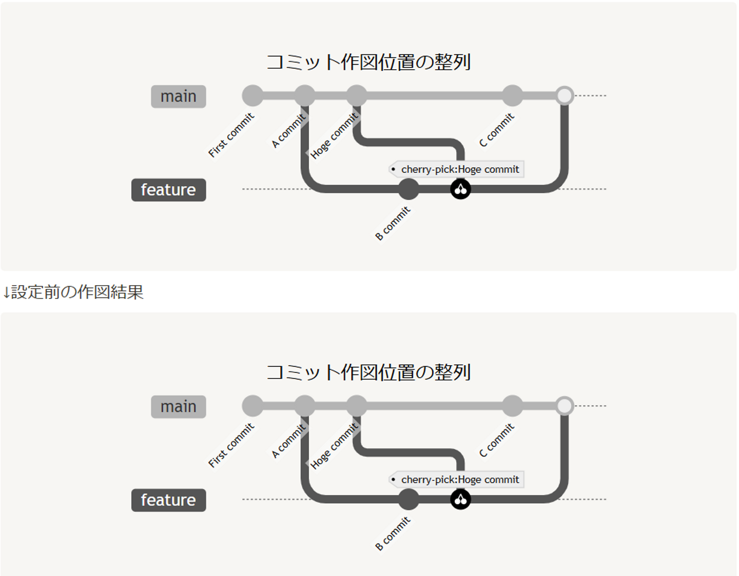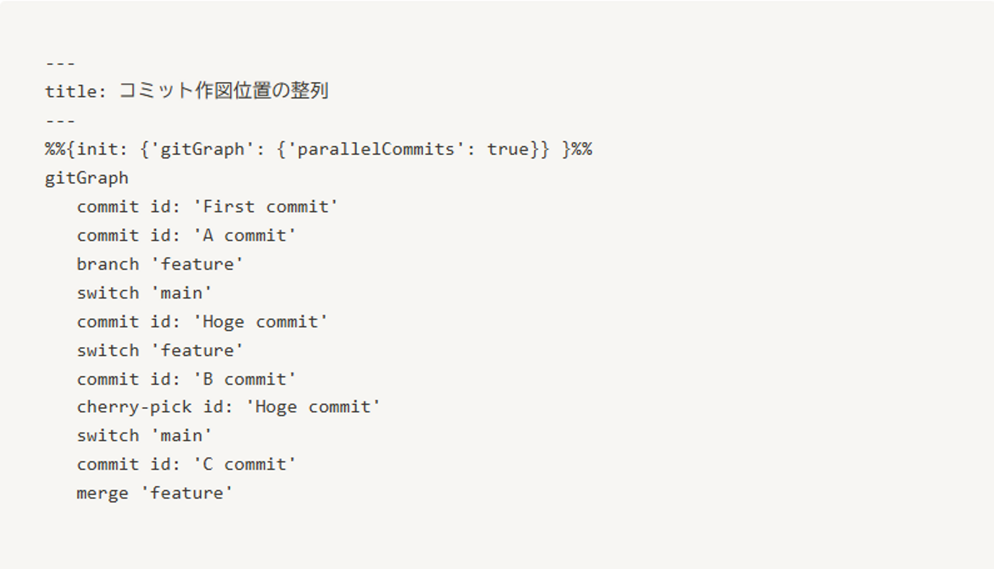 mermaidのGitブランチ図は指定時系列に従って作図が行われる。 今回でいうと「Hoge commit」の後に「B commit」が入っているように作図されている。 本設定は「Hoge commit」のコミットポイントの作図箇所と「B commit」のコミットポイントの作図箇所を揃える事ができる。 %%{init: {'gitGraph': {'parallelCommits': true}} }%%のように設定すると問答無用ですべてのコミットポイントを揃える。 特に設定しないと%%{init: {'gitGraph': {'parallelCommits': false}} }%%がデフォルトで設定されている。