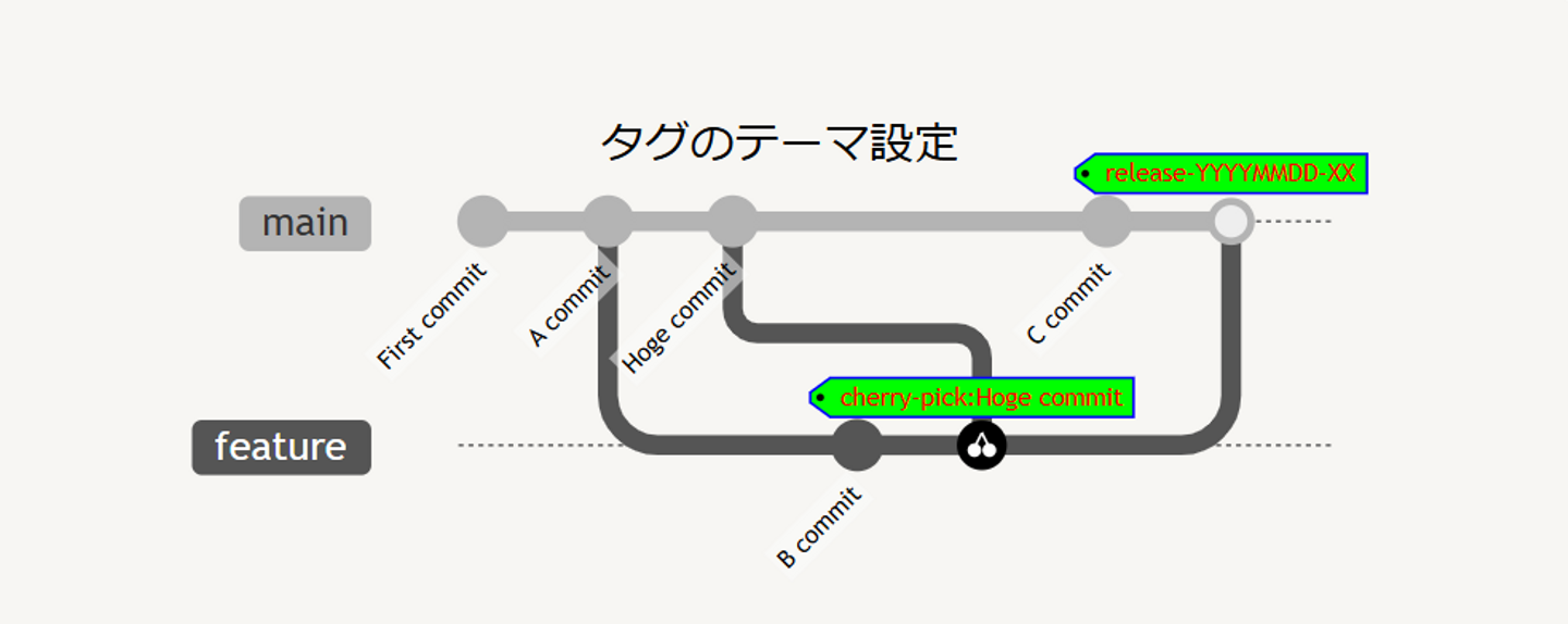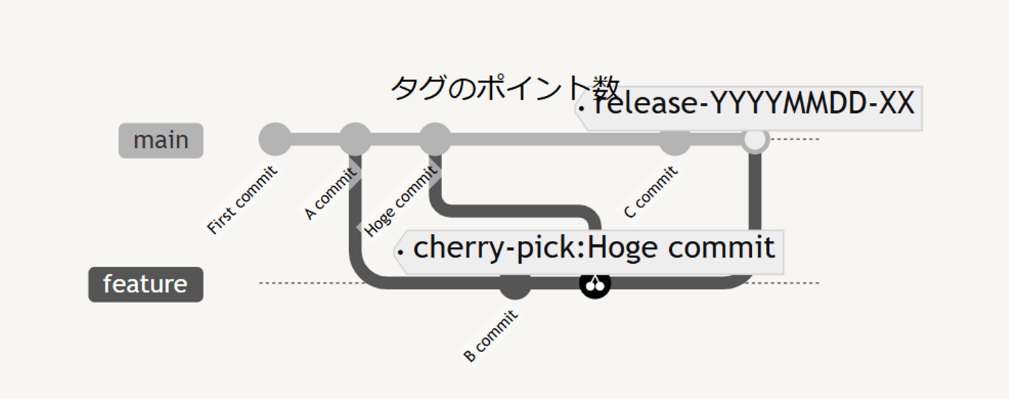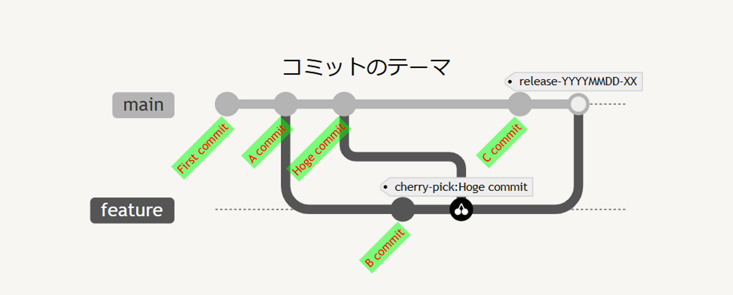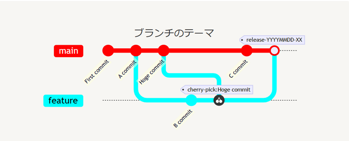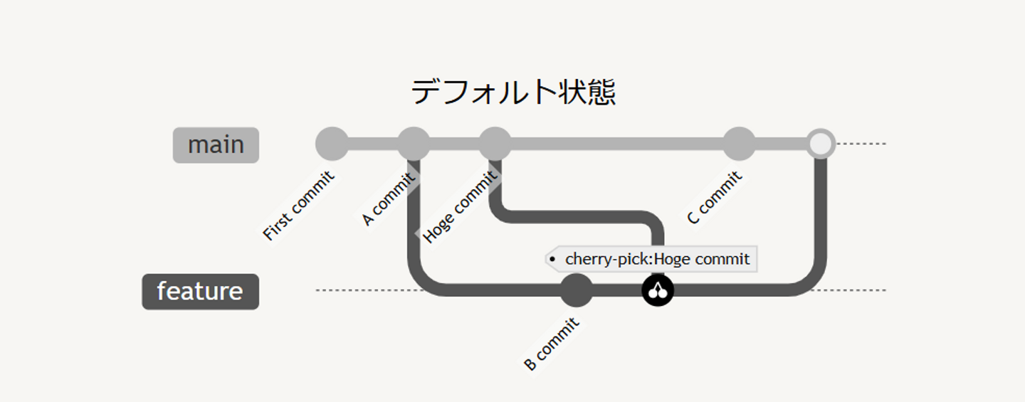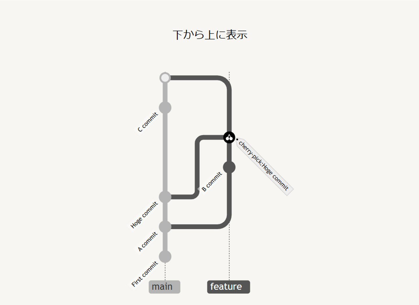 mermaidのGitブランチ図は指定時系列に従って作図が行われる。 今回でいうと「Hoge commit」の後に「B commit」が入っているように作図されている。 本設定は「Hoge commit」のコミットポイントの作図箇所と「B commit」のコミットポイントの作図箇所を揃える事ができる。 %%{init: {'gitGraph': {'parallelCommits': true}} }%%のように設定すると問答無用ですべてのコミットポイントを揃える。 特に設定しないと%%{init: {'gitGraph': {'parallelCommits': false}} }%%がデフォルトで設定されている。