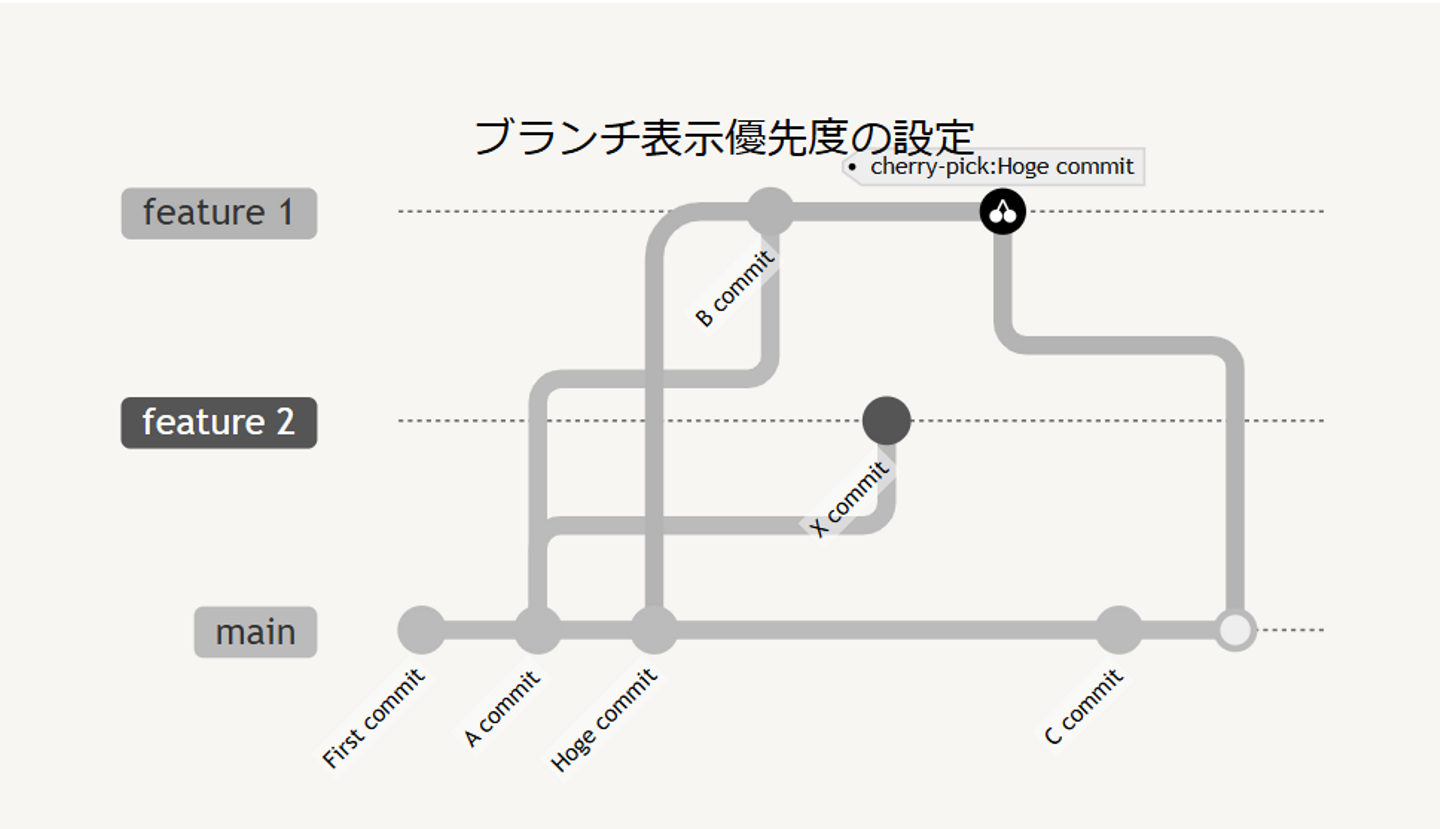 下記のように指定してfeature 1ブランチを最も上部に表示してみる。