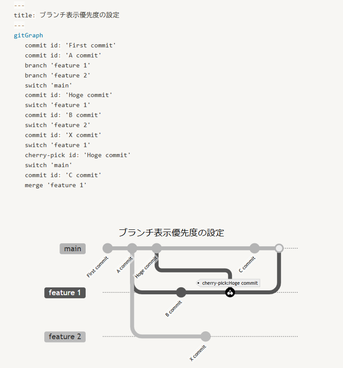 デフォルトブランチ(mainやmasterなど)以外を最も上部に表示したい場合の設定項目である。 %%{init: {'gitGraph': {'mainBranchOrder': 1}} }%%などのように設定する 何も指定していない状態だと%%{init: {'gitGraph': {'mainBranchOrder': 0}} }%%がデフォルトで設定されている。 細かいことは筆者もわかっておらず、現状引数で「0以外を指定すると2番目に指定したブランチが最も上部に表示される」くらいしか分かっていない。