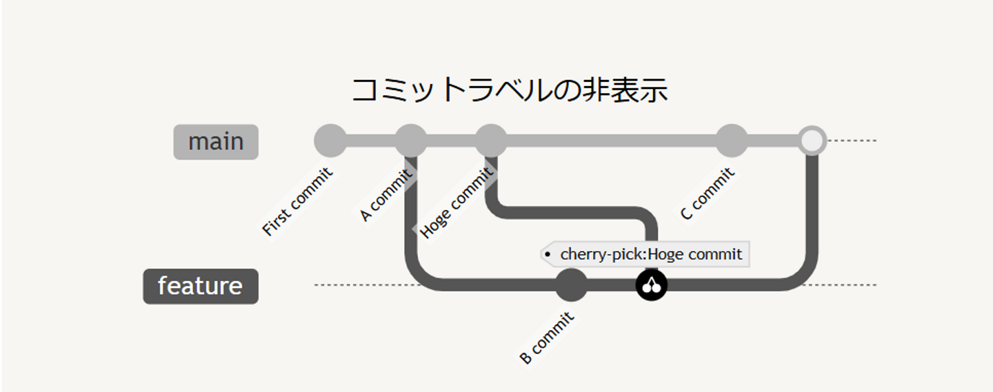 コミットラベルの表示非表示を設定する方法を記載する。 %%{init: {'gitGraph': {'showCommitLabel': false}} }%%のように記載するとコミットラベルを非表示にできる。 ちなみに何も指定しないと%%{init: {'gitGraph': {'showCommitLabel': true}} }%%が指定されている。