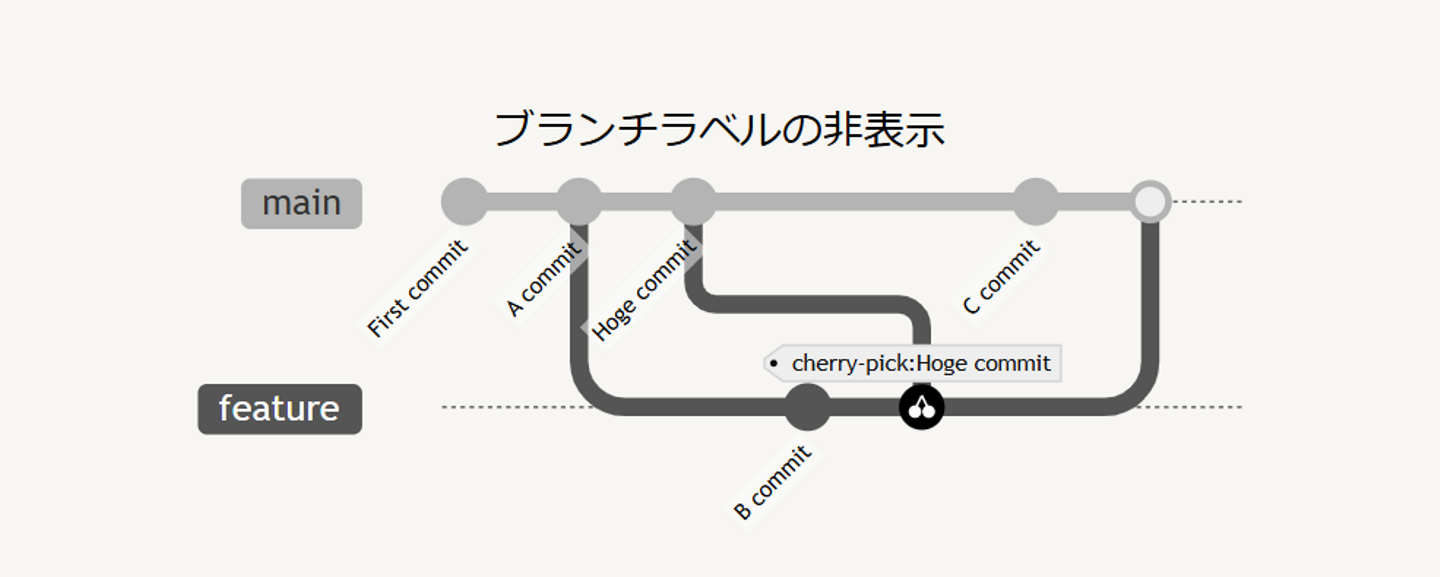 ブランチラベルの表示非表示を設定する方法を記載する。 %%{init: {'gitGraph': {'showBranches': false}} }%%のように記載するとブランチラベルを非表示にできる。 ちなみに何も指定しないと%%{init: {'gitGraph': {'showBranches': true}} }%%が指定されている。