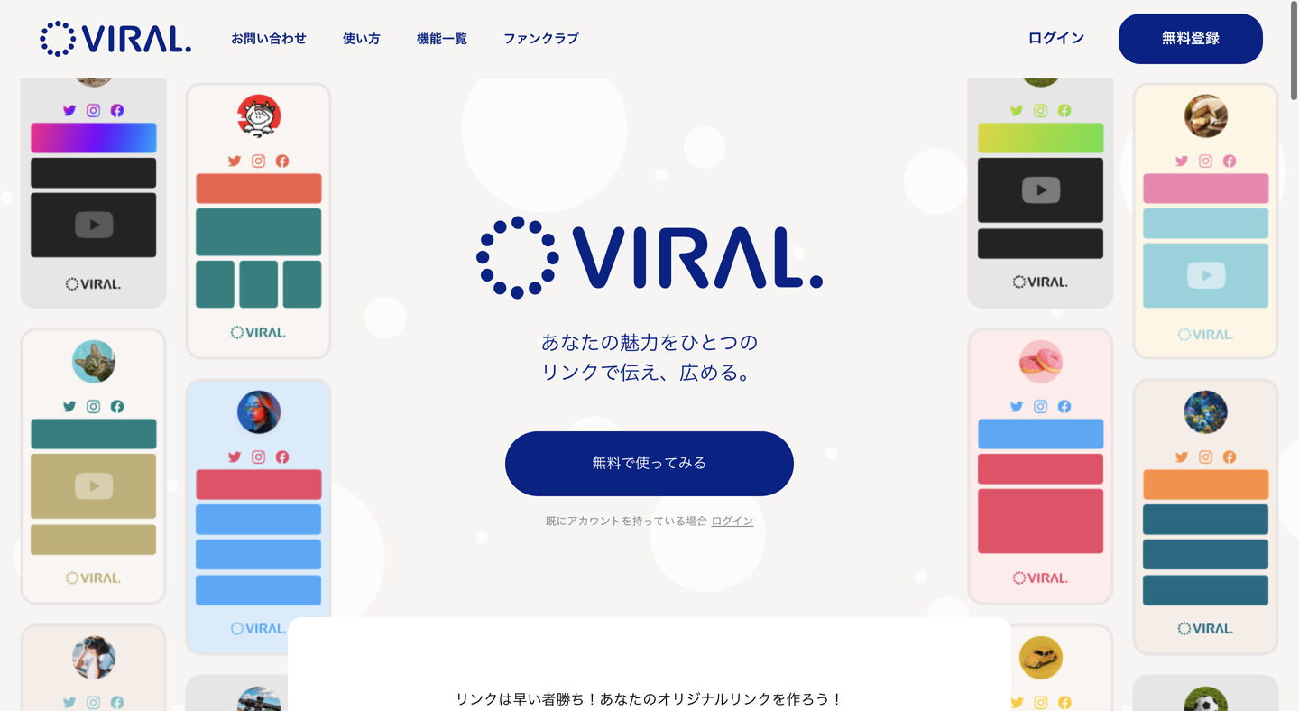 VIRAL(バイラル)は、クリエイターのためのリンクまとめプロフィール作成サービスです。