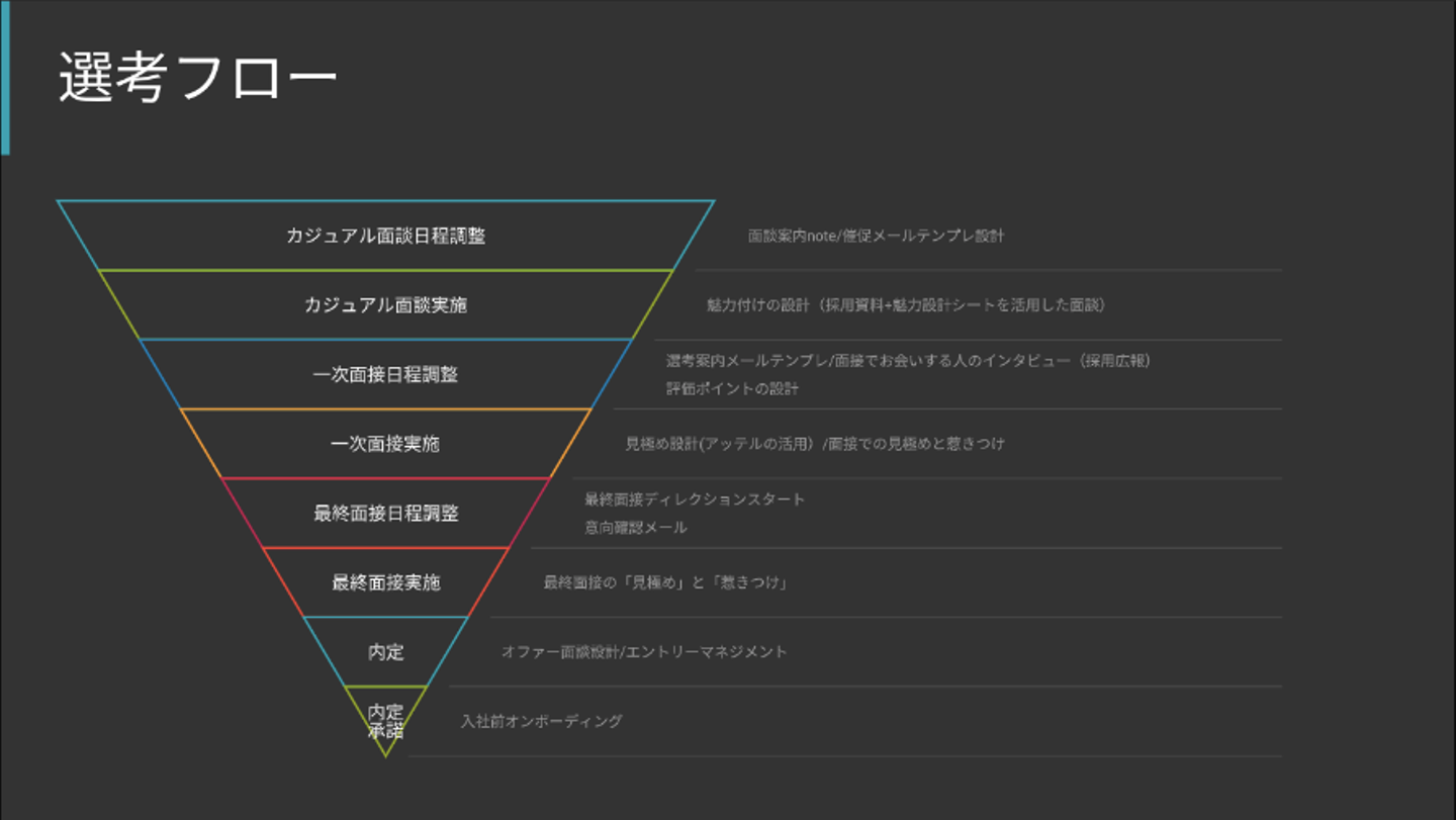 2019年12月ごろより弊社としてCXについてはアウトプットしていたのですが、下記のような選考フロー別で何を実施するべきかまで落とし込めていませんでした。