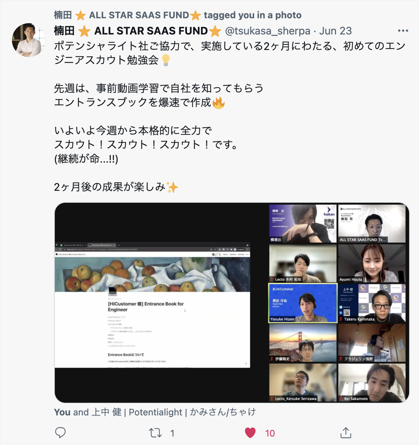 企業様の採用支援を行うにあたり、採用パートナー(私)の力だけでは採用成功は不可能です。企業様や弊社サポートメンバーの協力だけではなく、外部パートナーさんに協力いただくことも多いです。いつもありがとうございます!いつもお世話になりすぎているパートナーさんからお声がけいただき、「Wantedlyマニュアル作成」や「エンジニア勉強会」などの取り組みができたことは個人的にはとても嬉しかったです。
