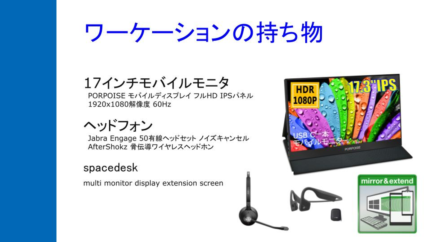 最初はなにを持っていくか迷いましたが、いまは下記で落ち着いています。普段の仕事環境と同じ効率的な作業環境を作る、ということをなにより大切にしています。