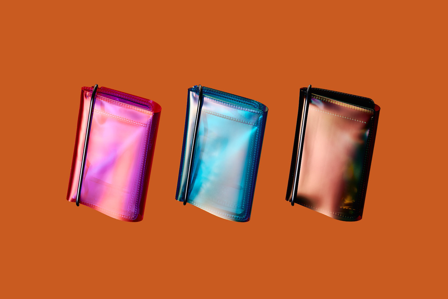 見る角度によって色が変化する偏光素材と、財布を開いた時の中の差し色がポイントです。