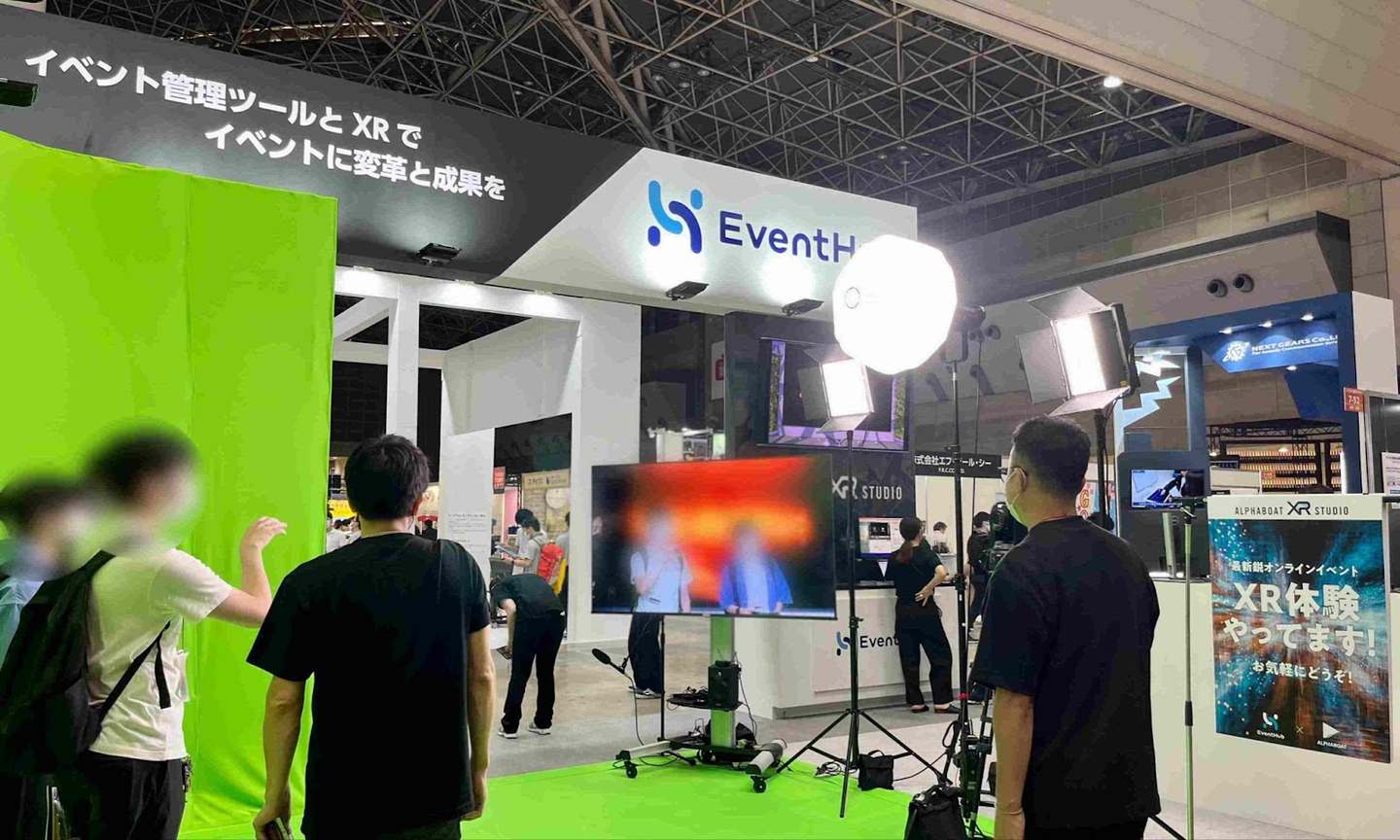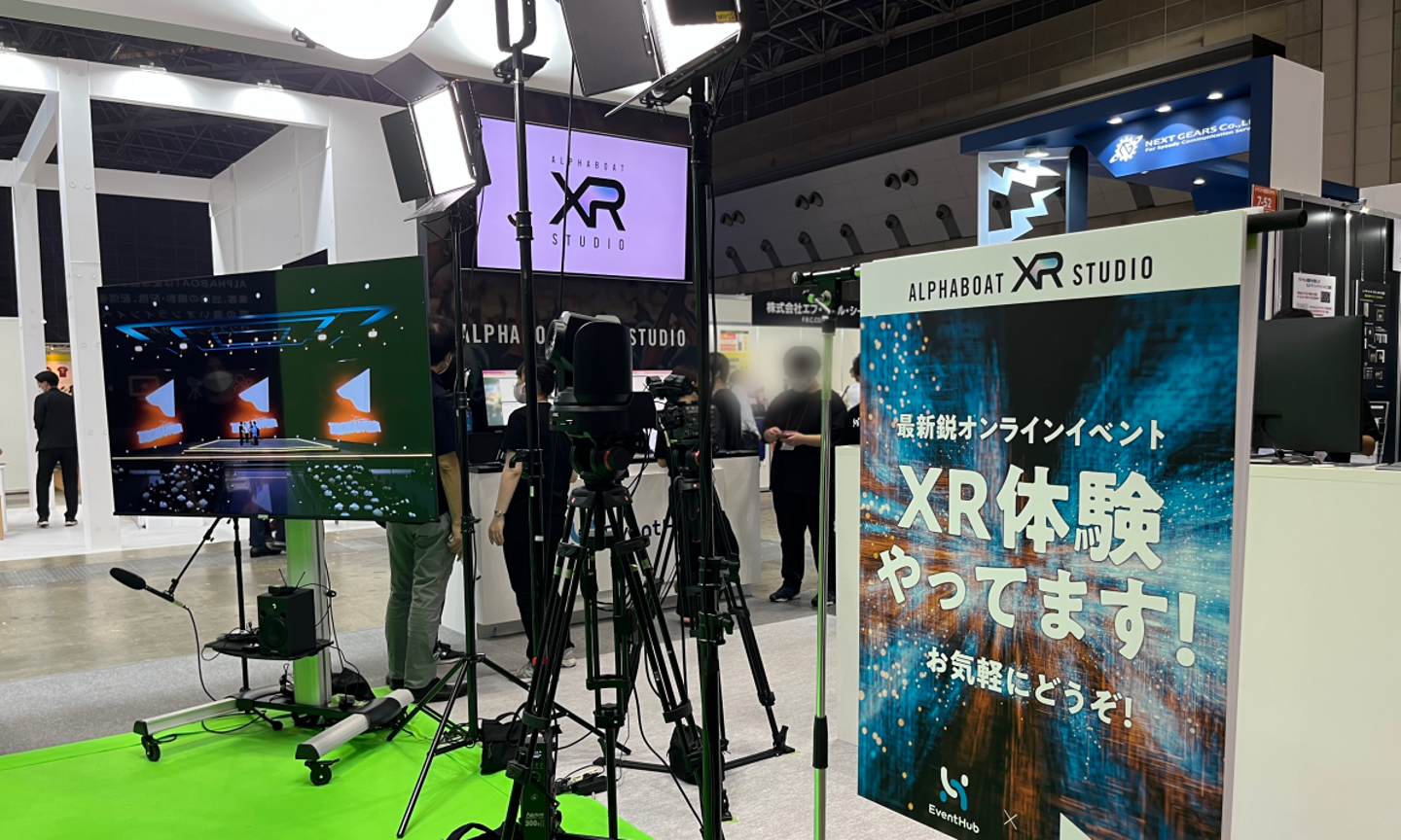 「Japan Event Week」は、イベント・ライブ・エンターテイメント・eスポーツに関するあらゆる製品・サービスが出展する総合展示会です。ALPHABOATは、その中で開催された「イベント総合EXPO」にEventHub社と共同出展。今年1月に開設したALPHABOAT XR Studio(※)を丸ごと持ち出し、来場者の皆様にXRを体験していただくという初の試みを行いました。