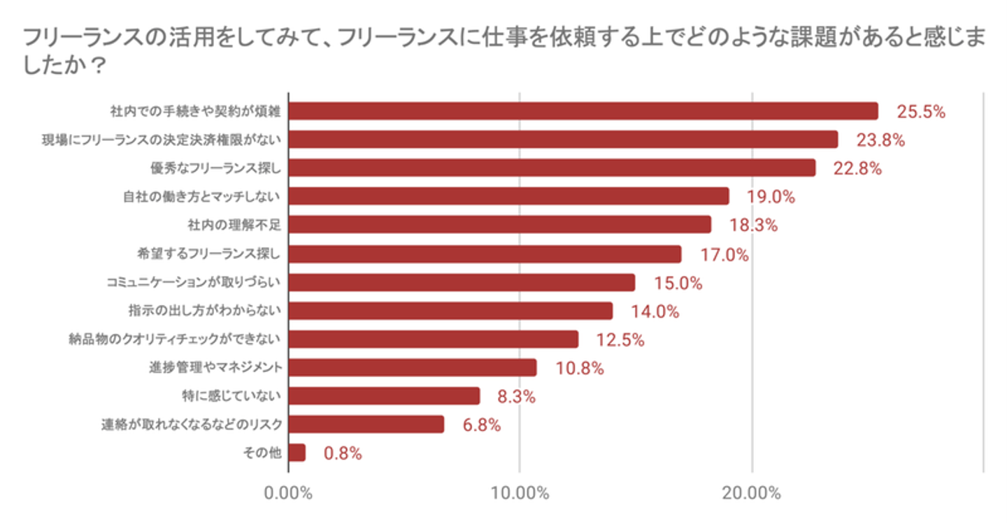 つまり、フリーランスへの発注意欲はあるものの、社内の制度設計や優秀な人材のネットワーク構築の不足が最も大きな問題となっています。