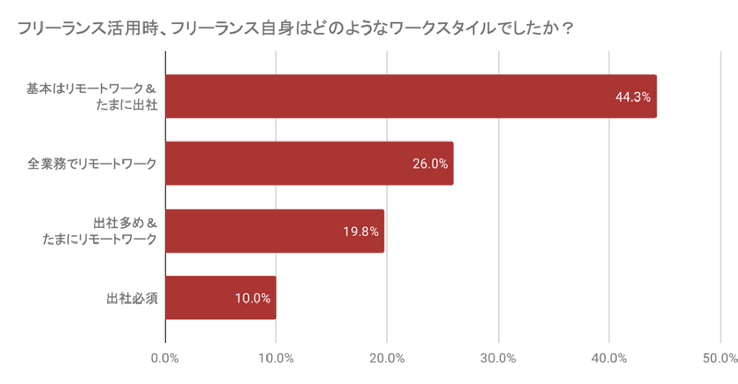 フリーランスも「全ての業務でリモートワーク(26.0%)」「基本はリモートワーク&たまに出社(44.25%)」と普及が進んでおり、働き方がより選択しやすくなっていることでしょう。
