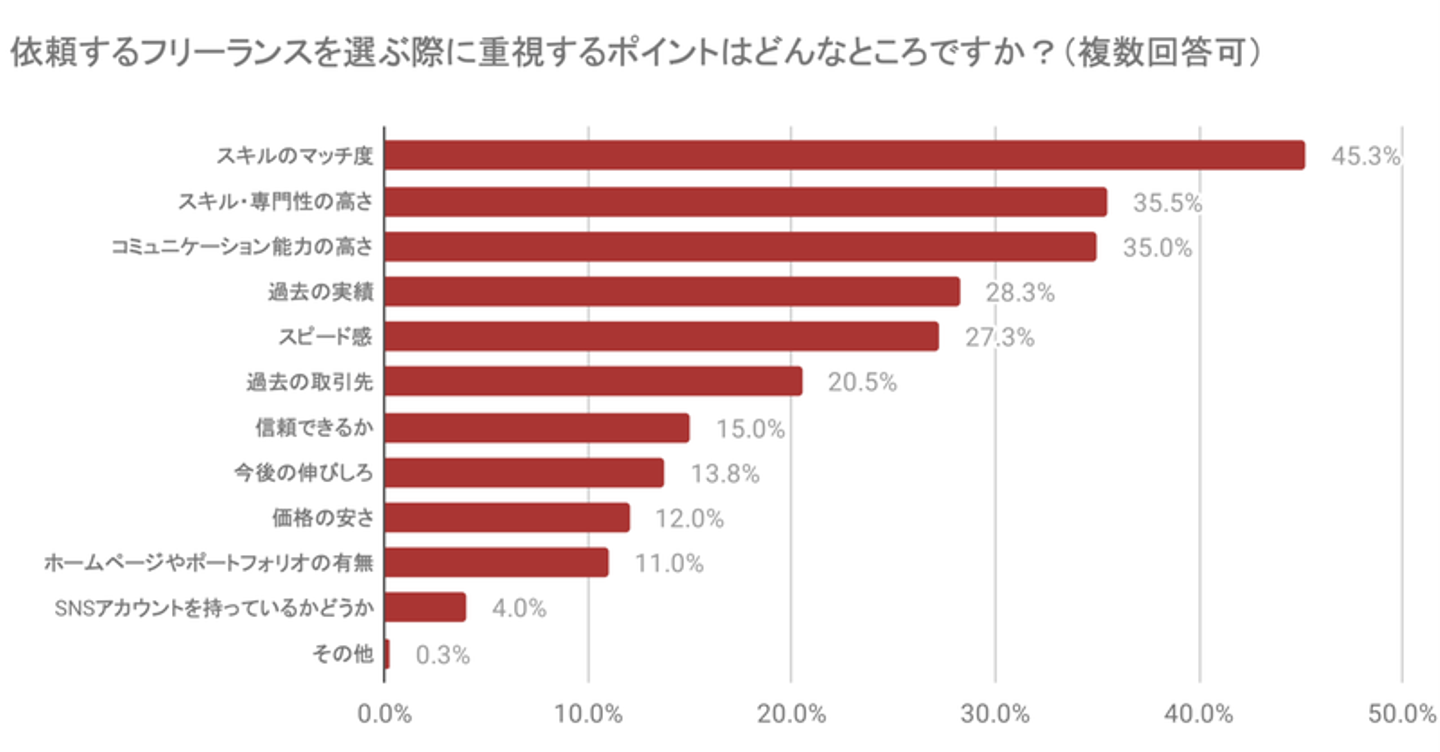 この結果から、企業の事業内容や抱える課題を日々のコミュニケーションから汲み取り、仕事に反映できるフリーランスは重宝されやすく、長期的な契約につながるのではないかと感じています。