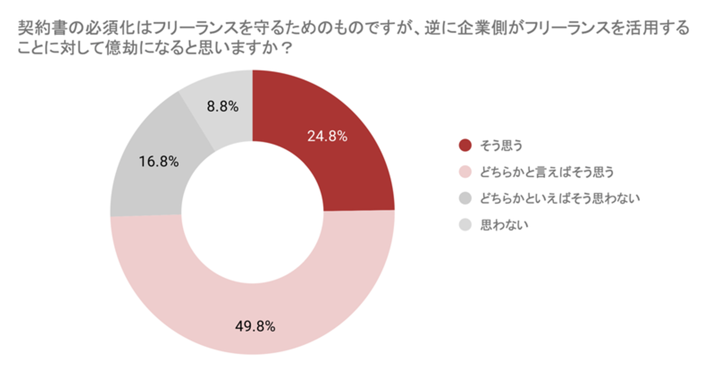契約時の書面必須化自体はフリーランスを守るための制度ではありますが、今回の調査では7割以上の方が「書面作成が義務化されることで、逆に企業側がフリーランス活用に対して億劫になると思う」