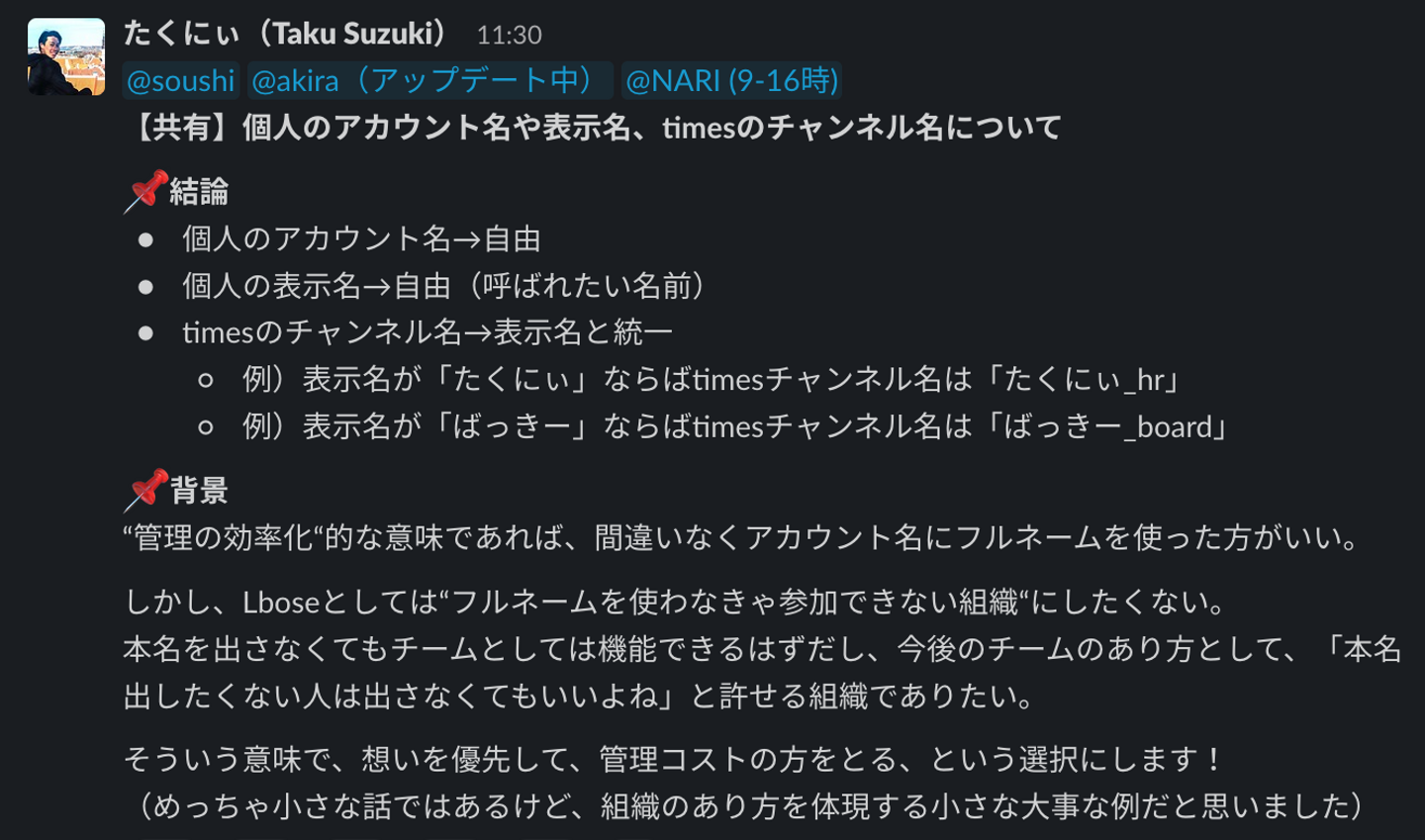 弊社、絶賛組織拡大中なのですが、今日、私と採用人事の責任者(たくにぃ)の間で「Slackでの、メンバーの表示名、個人タイムラインの名称をどうするか?」という議論が起こりました。