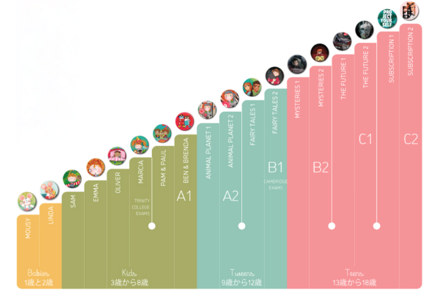 1歳から18歳までの各年齢に対応した18種類のコースを用意し、学習目標はCEFR(ヨーロッパ言語共通参照枠)に準拠しています。年齢ごとに適した学習内容を提供することで、無理なく自然に英語力を身に付ける環境を整えています。