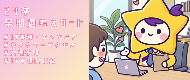 約8割がIT未経験で入社したメンバーが活躍する会社ですが、実際に前職は職種も業界も非常にさまざまです。営業や企画といったオフィスワーク系だけでなく、接客業・サービス業や芸能マネージャーなど、とてもバラエティ豊かなバックグラウンドを持った社員が活躍しています。年代も20代から30代まで幅広く、男女とも誰もが活躍できる組織です。