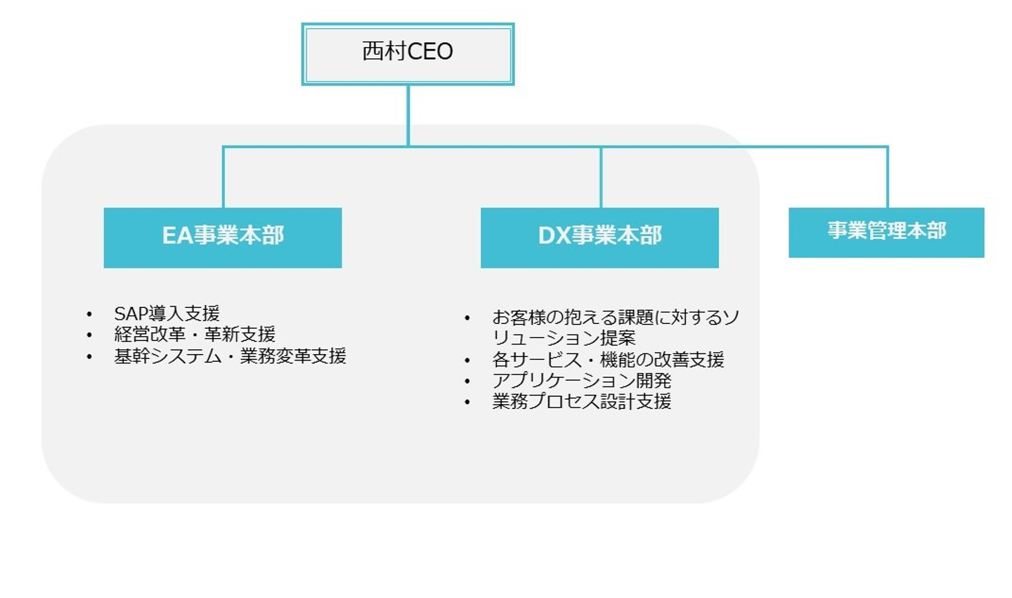現在、「EA事業本部」「DX事業本部」「事業管理本部」の3部門体制になっています。