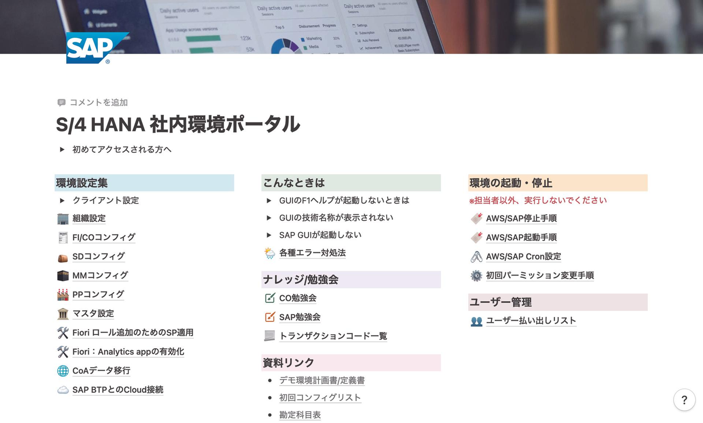 勉強会以外にもNotionというドキュメンテーション管理ツールで、社内のナレッジポータルも作っています。SAPの基本的な知識やプロジェクトの進め方、カスタマイズ・エラーの解決方法…など。皆さん新しいテクノロジーにも意欲的でワイワイ意見を出し合って学習しているんですよ。これから社員が増えても、みんなが気楽に参加して互いに高め合えるような環境を作っていきたいですね。