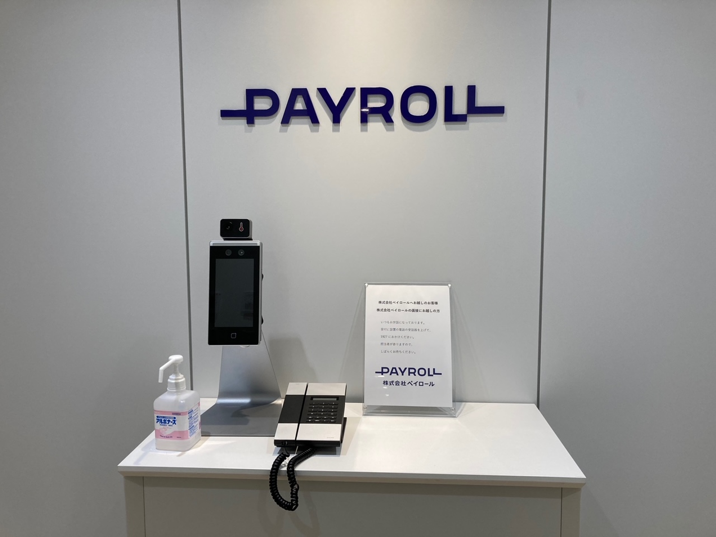 お客様が最初に足を踏み入れる受付には、新たなペイロールのロゴが飾られています。非接触型の体温計と消毒液も設置し、お客様に安心していただけるよう感染対策も気をつけています。