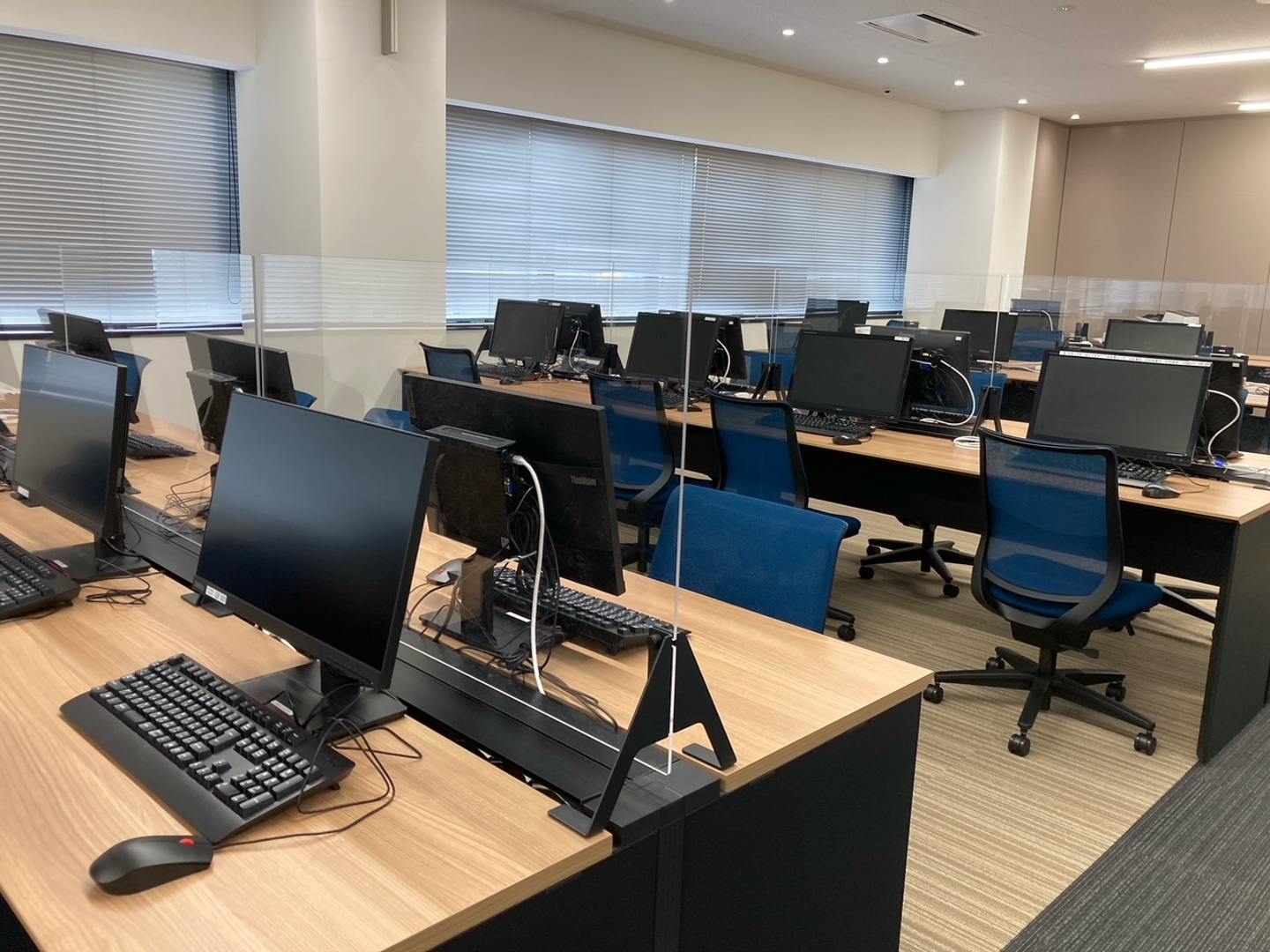 執務室は部署の仕切りなく、全員がワンフロアで業務をしています。少しゆとりを持った席配置で、感染対策のためのパーテーションも全席に設置されています。