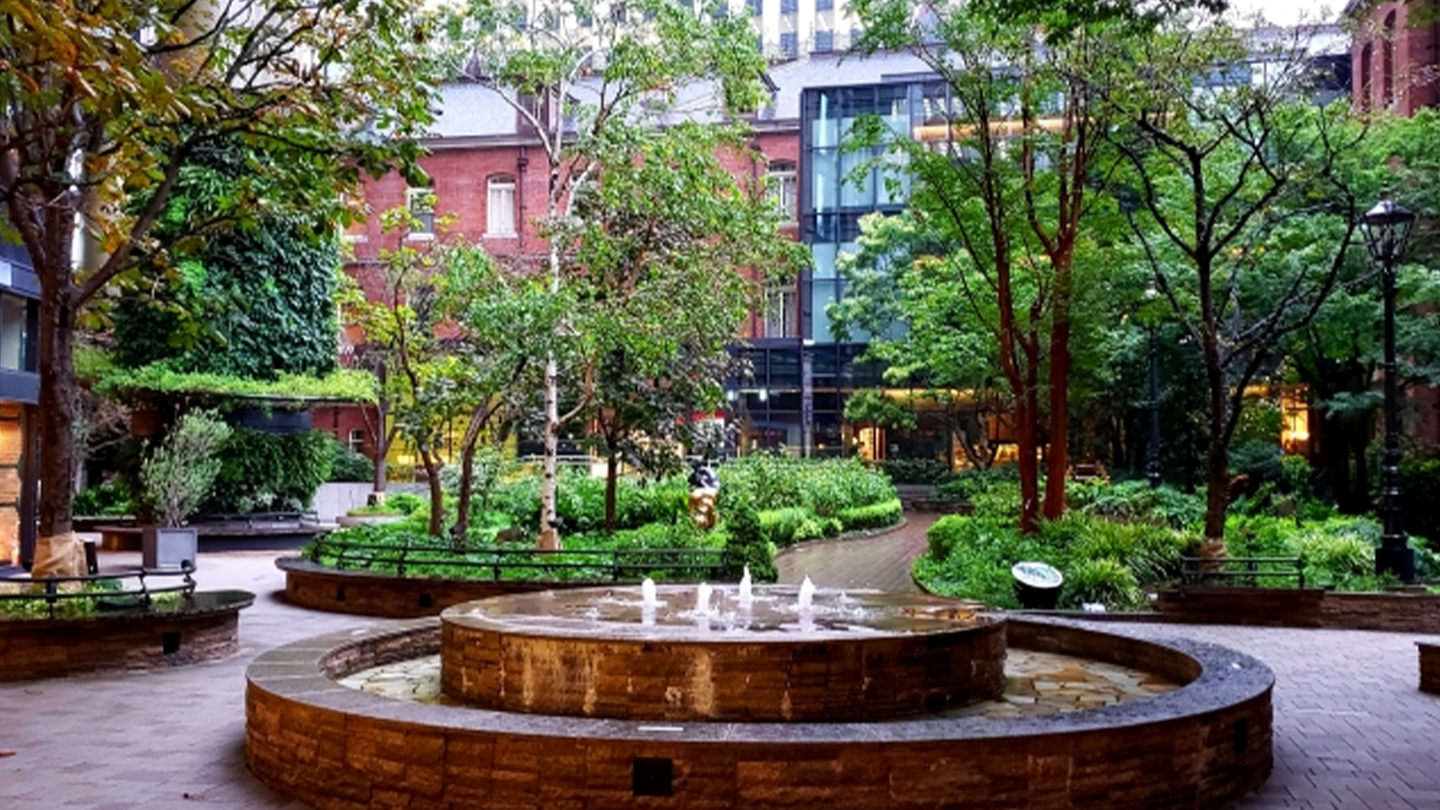 三菱一号館美術館前の中庭は、赤レンガのクラシカルな建物に囲まれた静かな憩いの空間。季節の草花や緑に彩られたベンチスペースでは、ランチを楽しんだり読書にふける人の姿も。都心とは思えない落ち着いた雰囲気が広がっており、ここでひといきつく社員も多くいます。