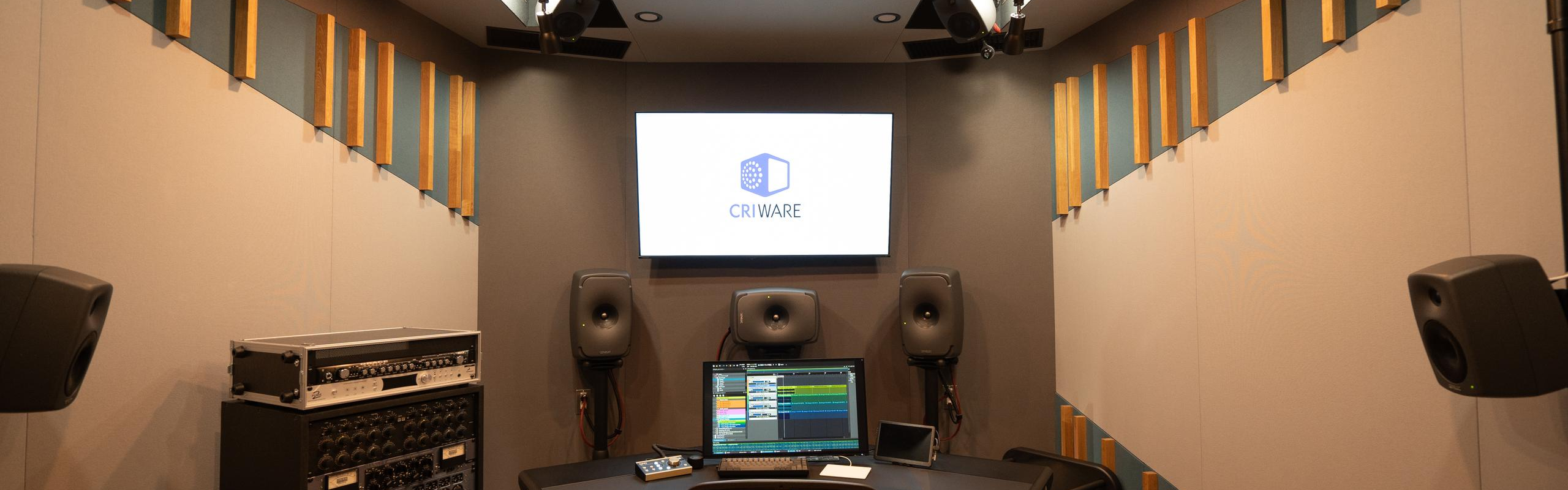 開発に必要な機材(ハイスペックPC、高解像度ディスプレイなど)やツールはもちろんのこと、研究開発に必要な設備、たとえばドルビーアトモスにも完全対応のスタジオ、執務室すぐ近くに防音室を整備するなど環境もしっかりと整えています。
