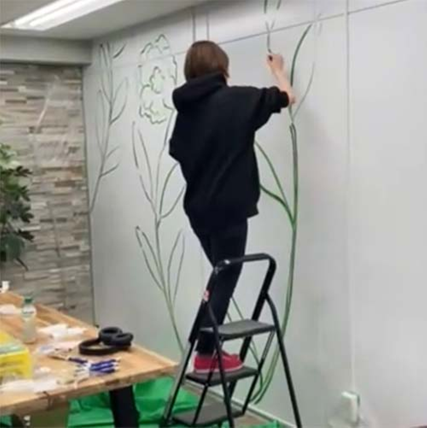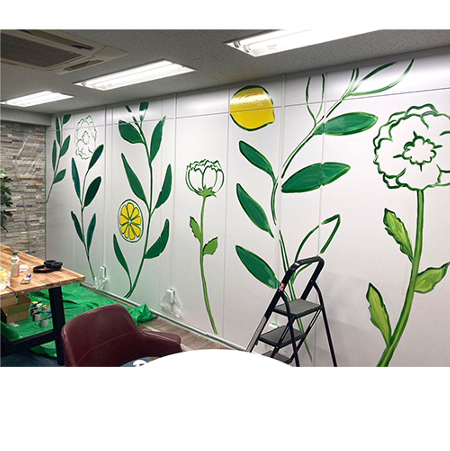 休憩室の壁面が白で地味だったので、絵を描くことになりました。