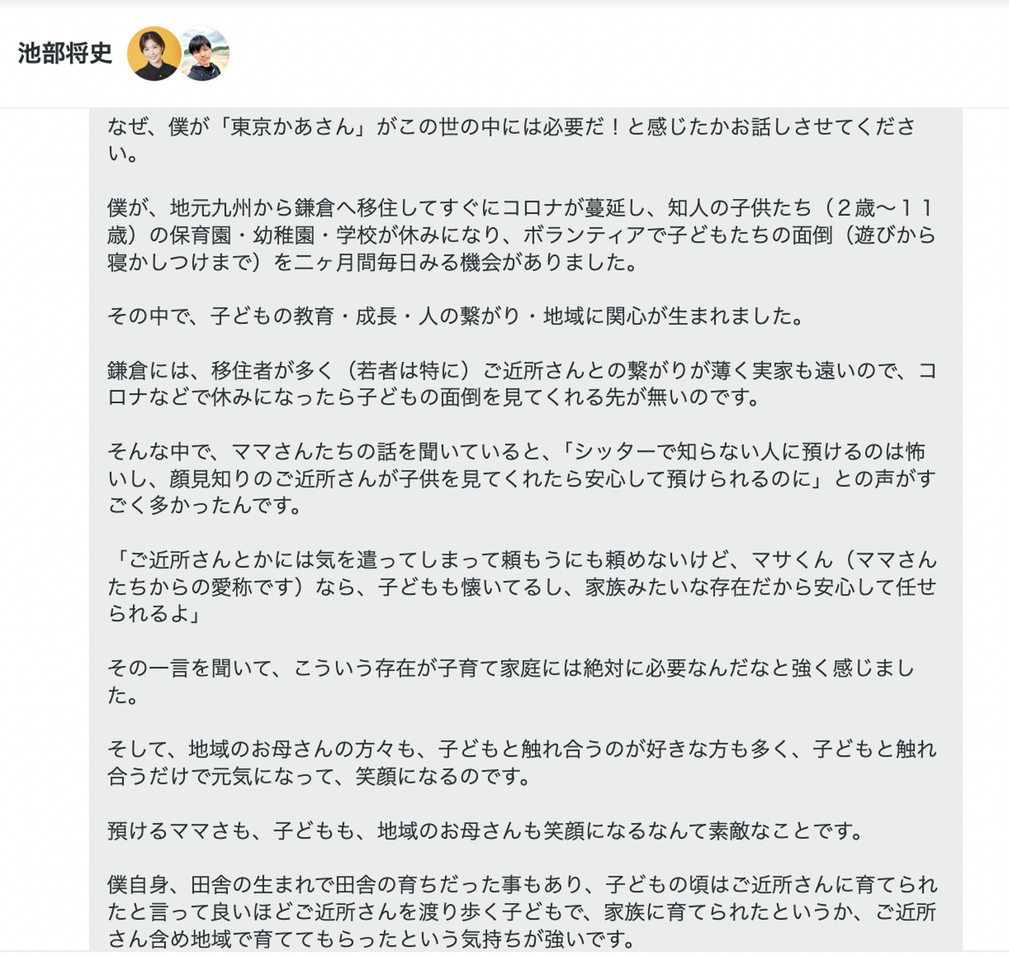 今回は、鎌倉での専属ベビーシッターの経験から「核家族の孤立や子育ての負担を解決したい」という思いを持って入社を決めた池部将史(いけべまさし)さんをご紹介します。