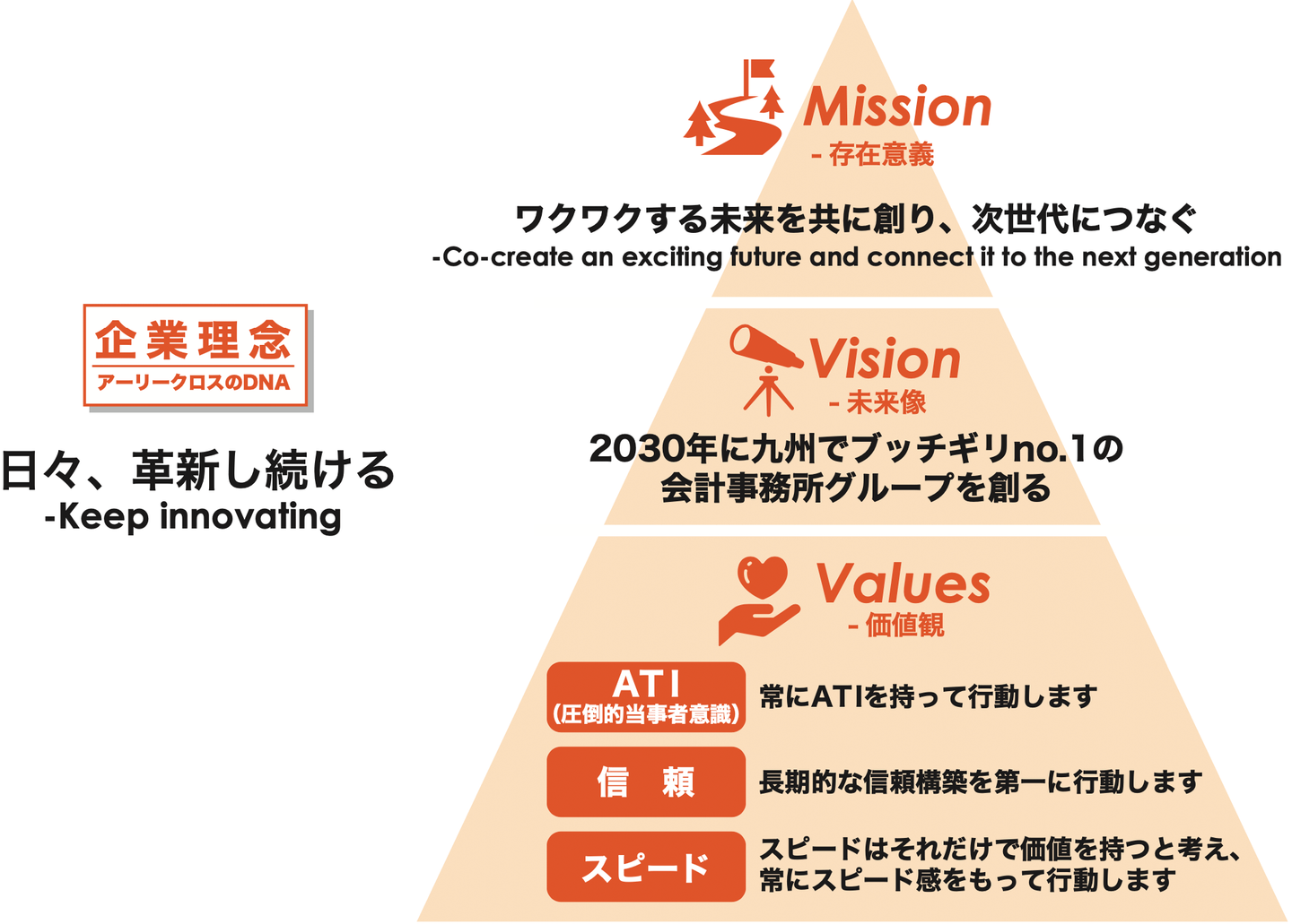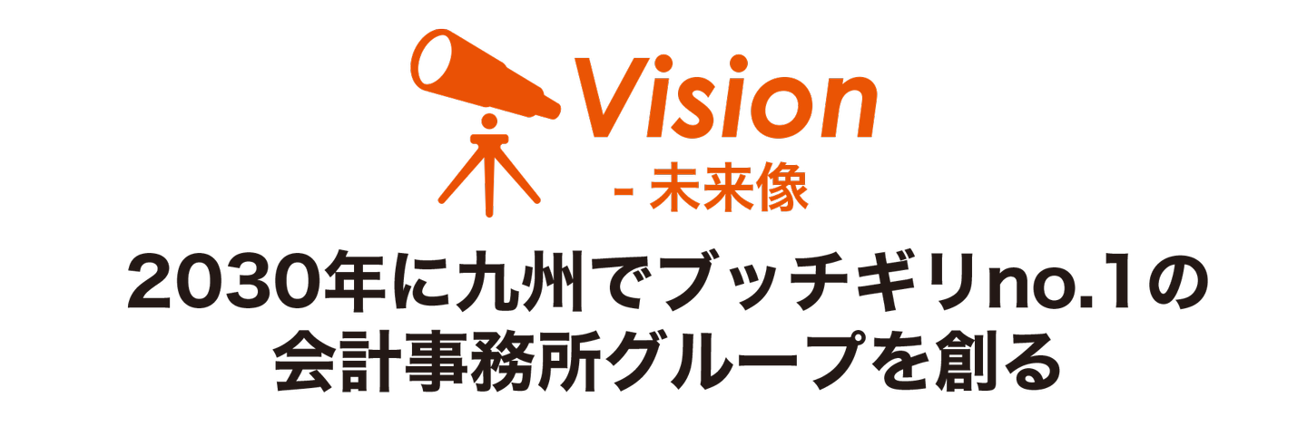 2030年までに「九州でブッチギリno.1の会計事務所」という高みに到達するために、次にお伝えするような価値観(Values)をもって日々、業務に励んでいます。