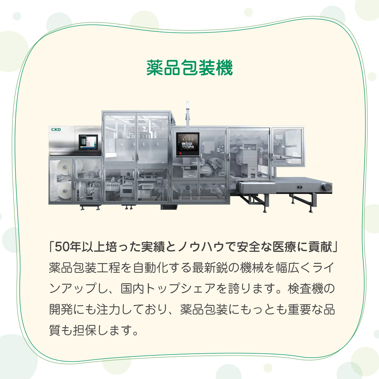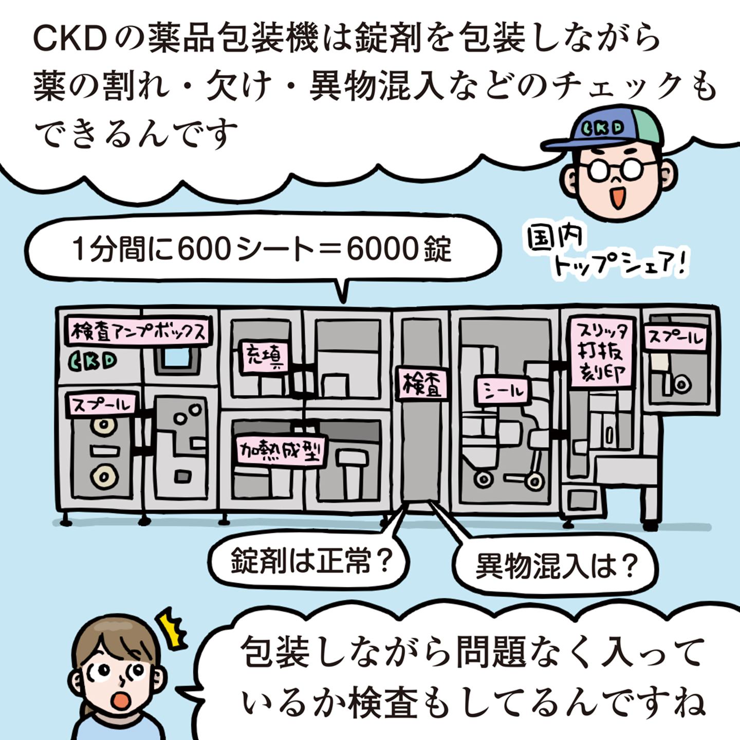 今回は薬品包装機です。薬を包装する機械もCKDの製品です。