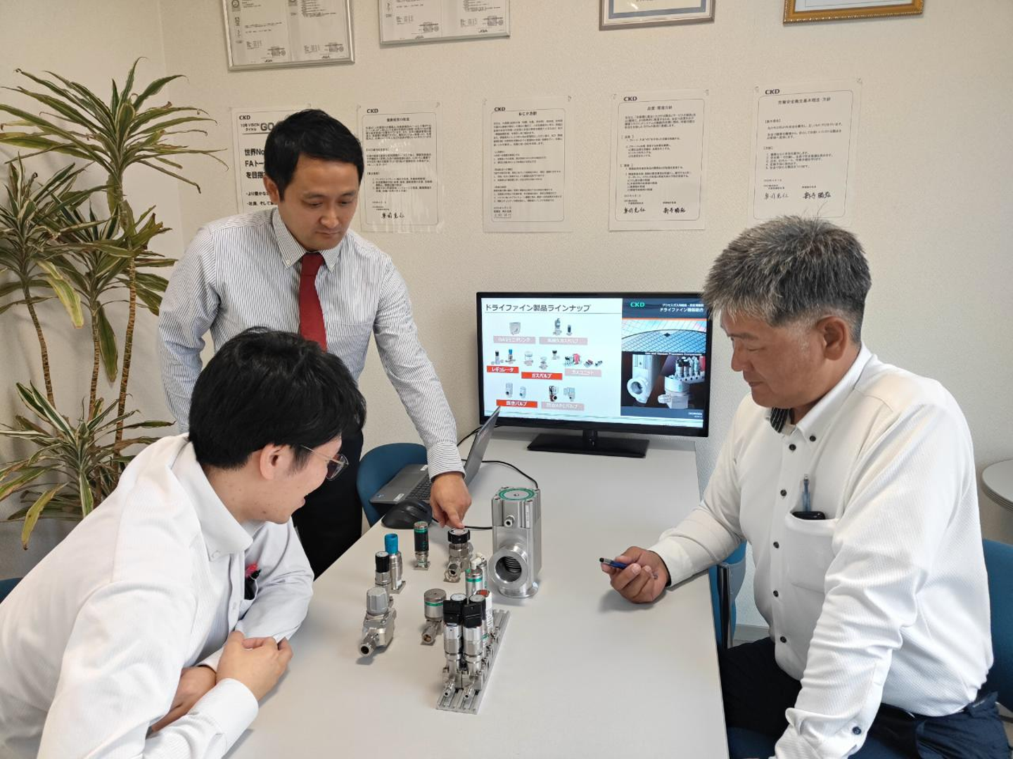 現在は半導体装置メーカーの専属営業として、お客様からの要望に基づく提案型営業を行っています。「こんな製品作れない?」「こんな仕組みを構築したい」ーーそんな声をもとに、社内の設計部門や工場と連携しながら製品開発を行っています。もちろん、簡単な課題ばかりではありませんが、担当しているお客様の装置を通じて、欧米・アジアなど世界中の半導体メーカーへCKD製品を納入する役割を担っています。