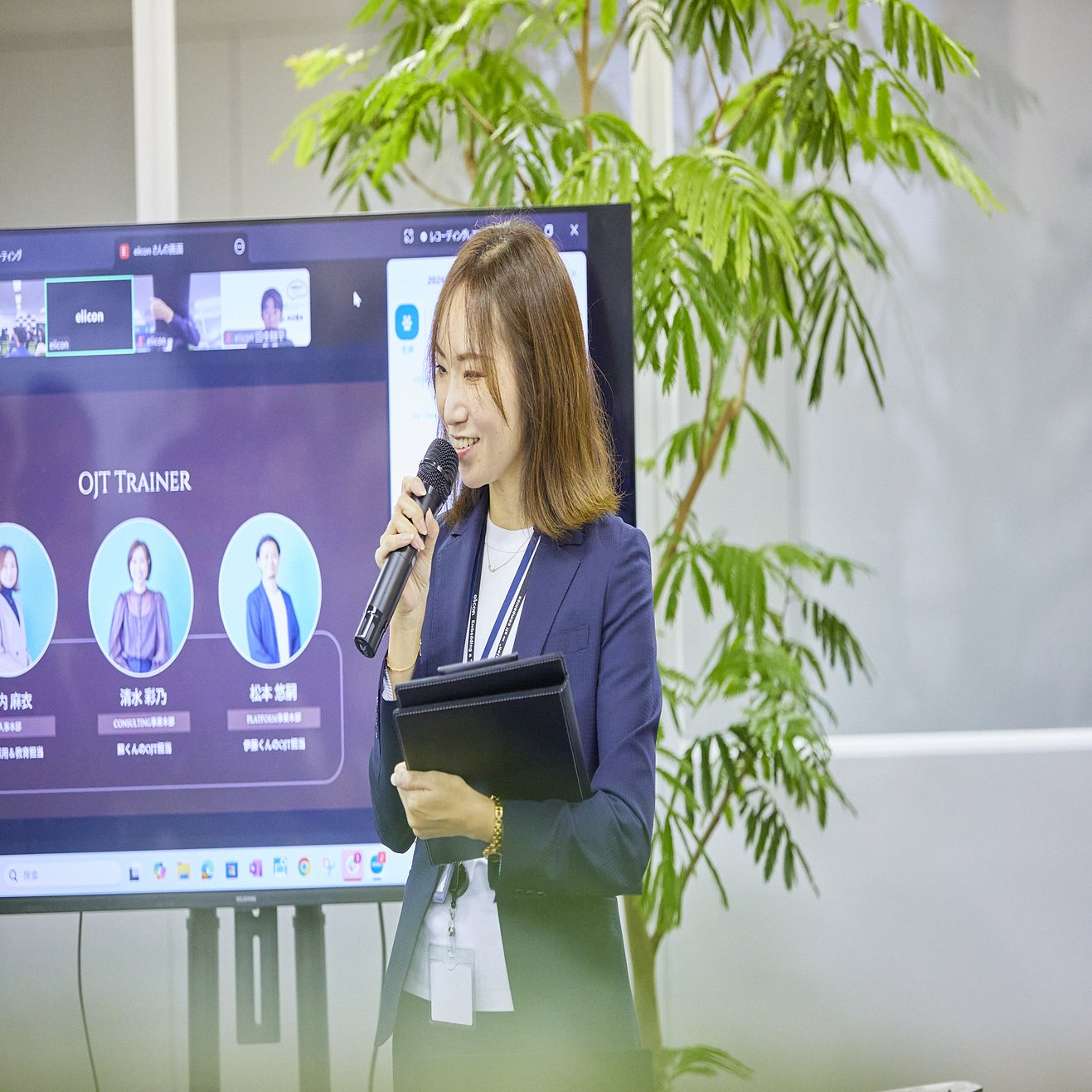 採用と教育を担当している山内からは、「OJT担当や私だけでなく社員全員が一緒になって、仲間として迎えていけるよう頑張りたいと思っています。二人の仲間はこんなにたくさんいます」と、eiiconメンバーが一体となって支えていくことを伝えました。