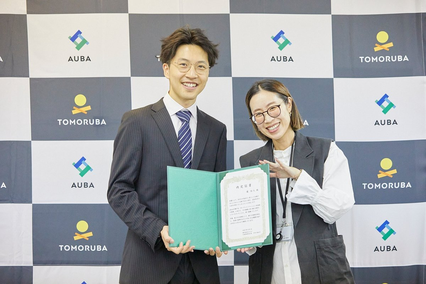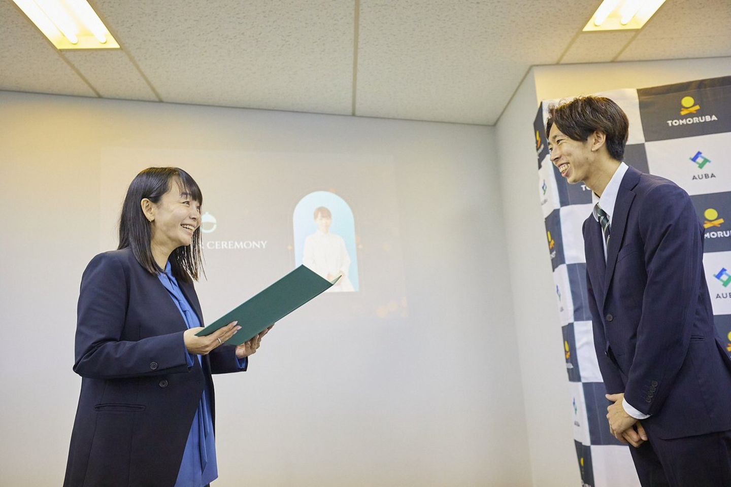 中村さんは内定証書を直接手渡しながら、「eiiconが掲げる『オープンイノベーション先進国』の実現に向けて、この挑戦にともに臨む決断をしていたいけたことに深く感謝いたします。今後、私たちの仲間として新たな価値を創出し、社会変革をもたらす大いなる飛躍を遂げられることを、心より期待しています」とメッセージを贈りました。